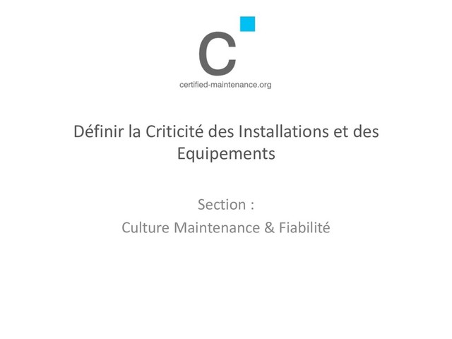 pas la même criticité, certains peuvent tomber en panne sans réellement affecter la production, la sécurité ou l’environnement. Il peut s’agir d’équipement dédoublés, ou d’équipements utilisés occasionnellement. • Par contre, d’autres équipements doivent impérativement être en bon état de fonctionnement. A défaut, l’entreprise pourrait perdre des ventes, des clients pourraient être livrés en retard, des personnes pourraient être blessées ou des dégâts pourraient être causés à l’environnement. Ce sont les équipements critiques. • Les efforts de la maintenance doivent porter en priorité sur ces équipements. Le développement des bonnes pratiques commencera par ces équipements. Copyright certified-maintenance.org Réseau des Responsables Maintenance & Fiabilité des Pays Francophones 2