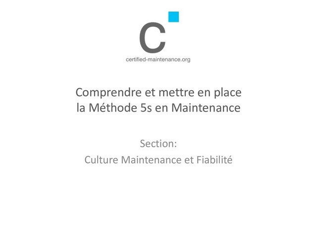 départ des objectifs ambitieux : – Les résultats doivent être visibles, réels, concrets et pérennes ! – Toute l'usine doit à terme être sous 5S, ateliers, bureaux, vestiaires, etc… • Le Comité de Direction doit être impliqué et supporter de façon visible le projet 5S : – L'avancement des travaux doit être régulièrement suivi en Comité de Direction. – Les personnes qui s'impliquent sur les 5S doivent être valorisées. • L'ensemble des documents, référentiels et outils créés, doivent être simples à comprendre, faciles d'utilisation et très visuels : – Photographier les ateliers avant et après la démarche 5S pour montrer l'évolution et mettre en évidence les progrès. • L'ensemble des opérationnels de l'usine doit être formé aux bases du 5S. • Inclure le 5S dans le parcours d'intégration des nouveaux embauchés. • Fixer le 5S comme objectif de chaque Responsable lors de son entretien annuel. Copyright certified-maintenance.org Réseau des Responsables Maintenance & Fiabilité des Pays Francophones