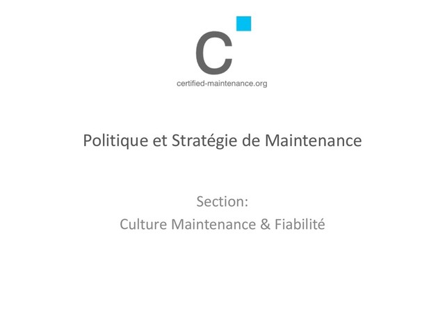 qui permet d’atteindre des résultats attendus, doit être déclinée en une stratégie maintenance. • Cette stratégie maintenance favorisera selon les cas la fiabilité, la compression des coûts, la rentabilité des capitaux engagés, ou toute combinaison de ces trois dimensions. • Elle sera ensuite déclinée en politiques de maintenance adaptées aux différentes installations. Des politiques de « zéro panne » ou de « marche jusqu’à la panne », variables éventuellement d’une installation à l’autre, sont deux exemples extrêmes mais régulièrement appliqués de politiques de maintenance. • Généralement appelée « Politique de Maintenance », décrivant la stratégie de Maintenance et les Politiques associées, est communiquée à l’ensemble des Acteurs concernés. Copyright certified-maintenance.org Réseau des Responsables Maintenance & Fiabilité des Pays Francophones 2