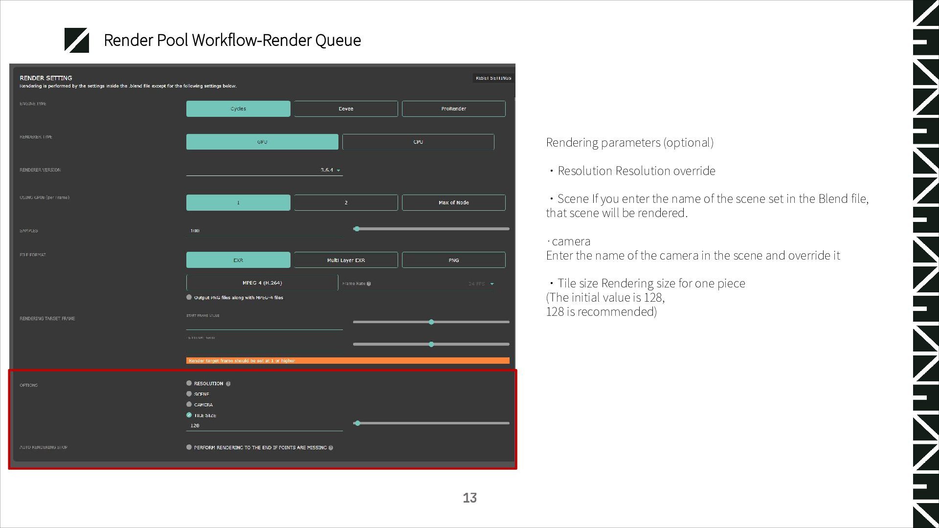 Blender version RENDERER VERSION Select Cycles Engine, Eevee Engine USING GPUs(per frame) Selecting the number of GPUs to use (GPU mode only) ◦ ITERATIONS / SAMPLING: sampling value. The initial value is 100. ◦ FILE FORMAT: Export format ◦ RENDERING TARGET FRAME - START FRAME VALUE : Specify the beginning of the frame range to output. - END FRAME VALUE: Specify the end of the frame range to output. Setting values other than these are settings in the .blend file. References and renders the value. 12