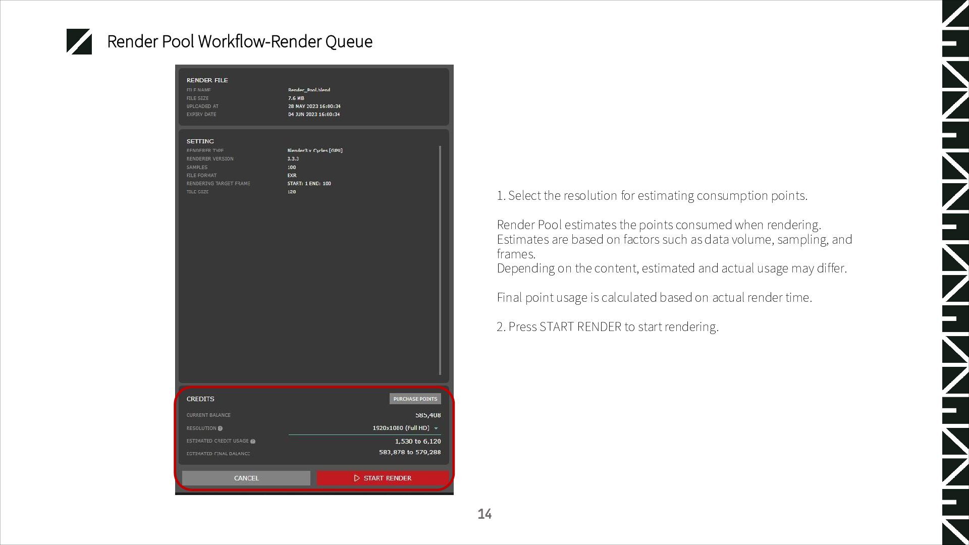 consumption points. Render Pool estimates the points consumed when rendering. Estimates are based on factors such as data volume, sampling, and frames. Depending on the content, estimated and actual usage may differ. Final point usage is calculated based on actual render time. 2. Press START RENDER to start rendering. 14