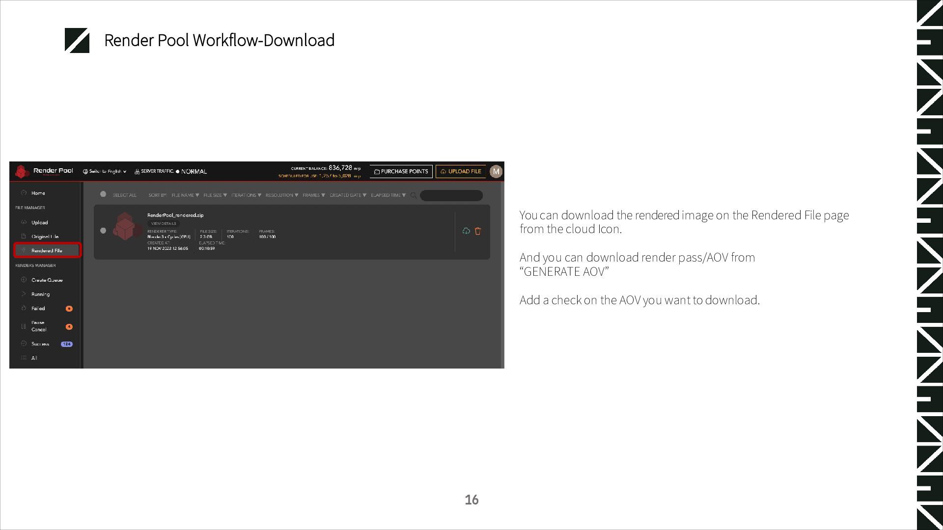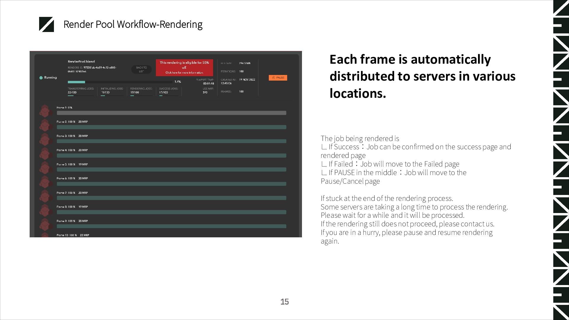 Success:Job can be confirmed on the success page and rendered page ∟ If Failed:Job will move to the Failed page ∟ If PAUSE in the middle:Job will move to the Pause/Cancel page If stuck at the end of the rendering process. Some servers are taking a long time to process the rendering. Please wait for a while and it will be processed. If the rendering still does not proceed, please contact us. If you are in a hurry, please pause and resume rendering again. 15 Each frame is automatically distributed to servers in various locations.