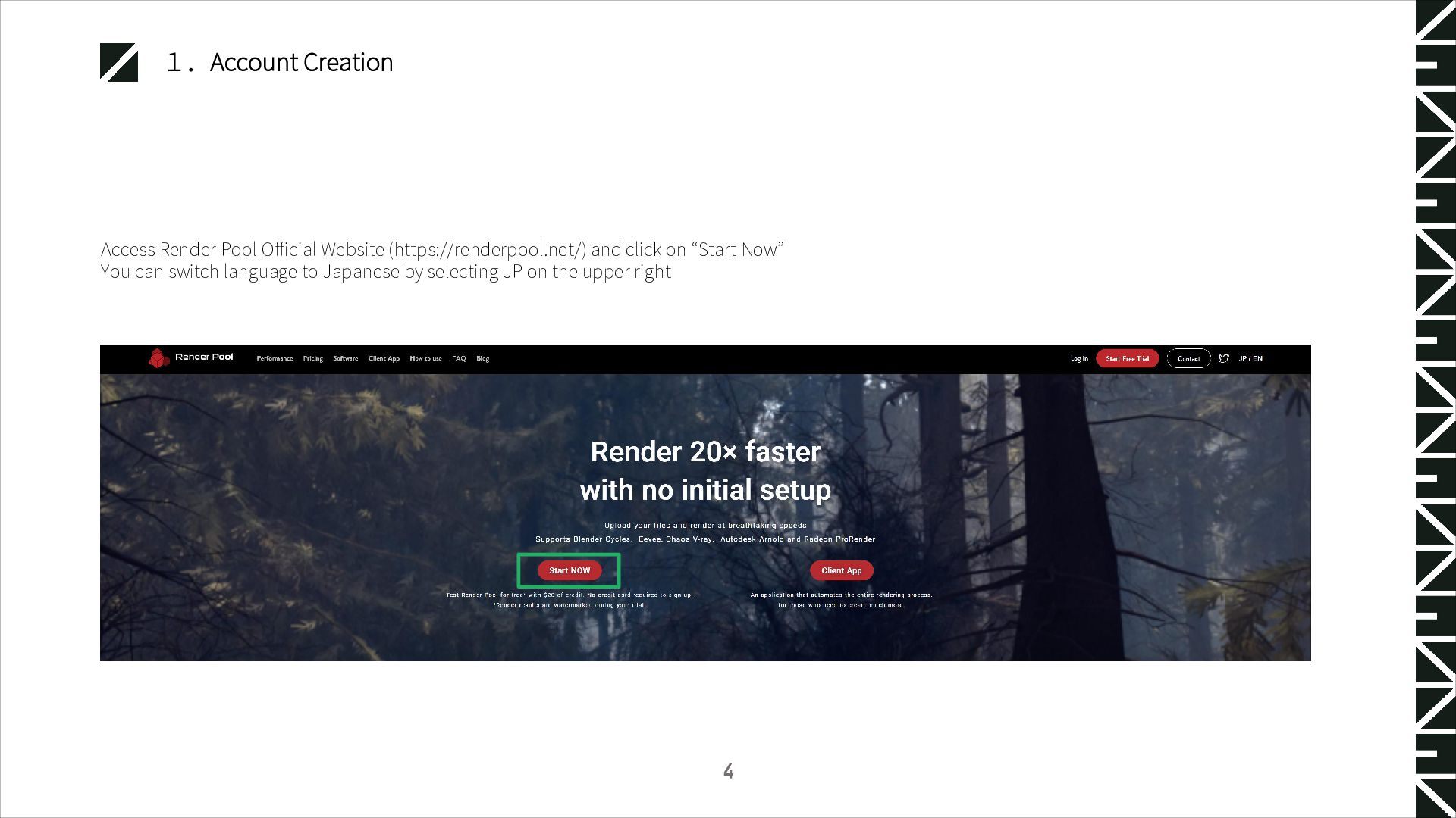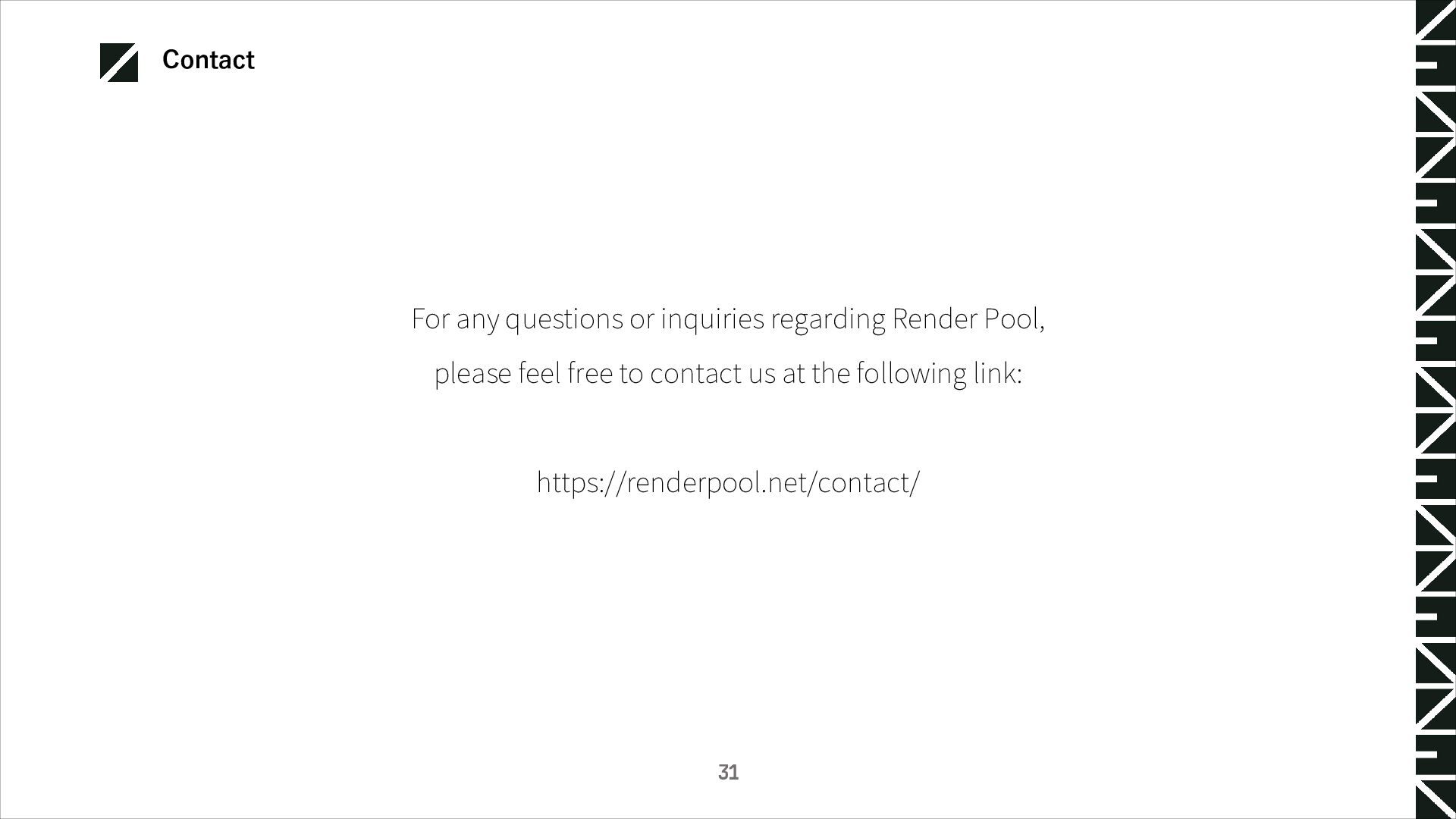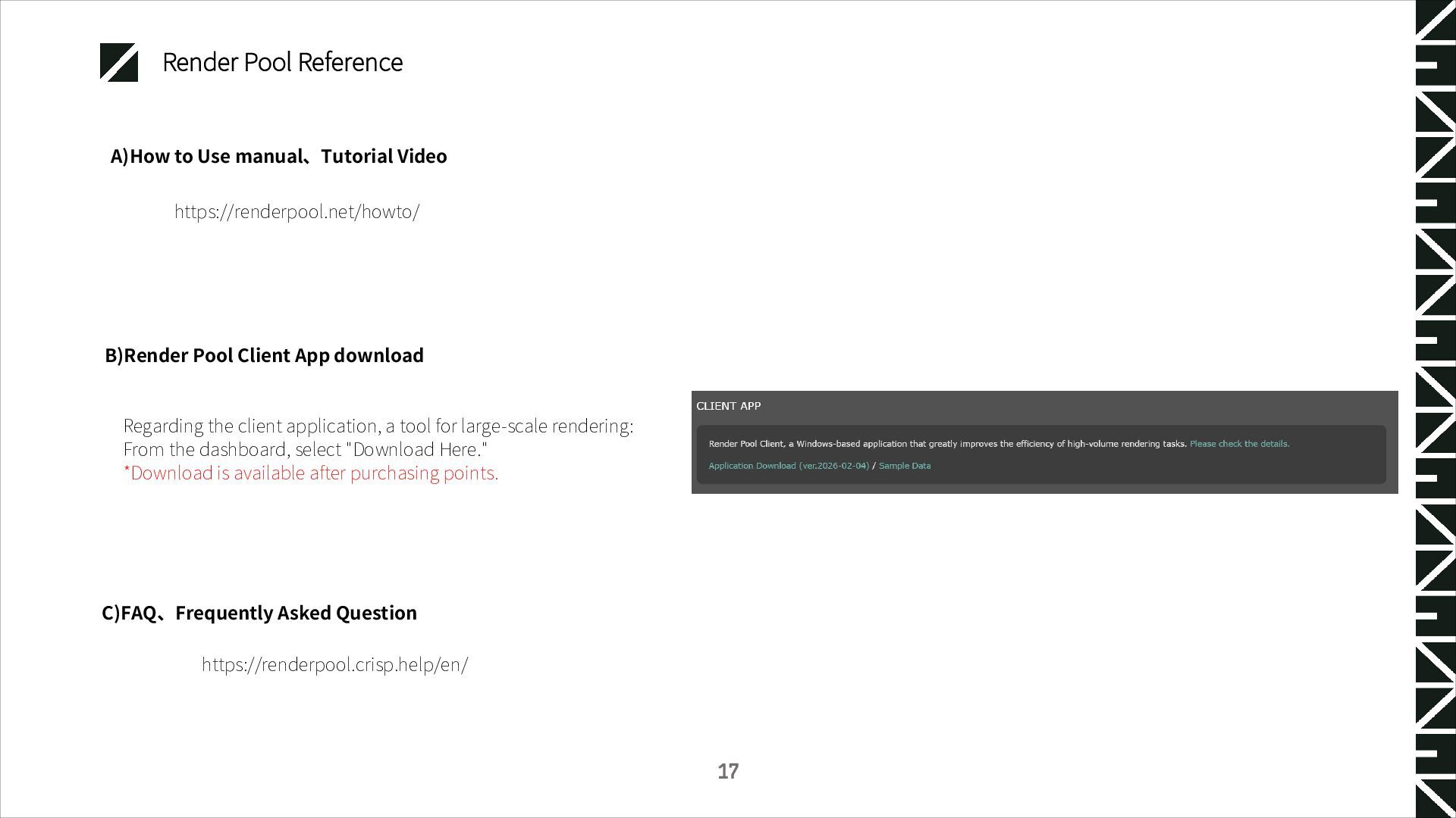 the client application, a tool for large-scale rendering: From the dashboard, select "Download Here." *Download is available after purchasing points. B)Render Pool Client App download https://renderpool.crisp.help/en/ C)FAQ、Frequently Asked Question 17