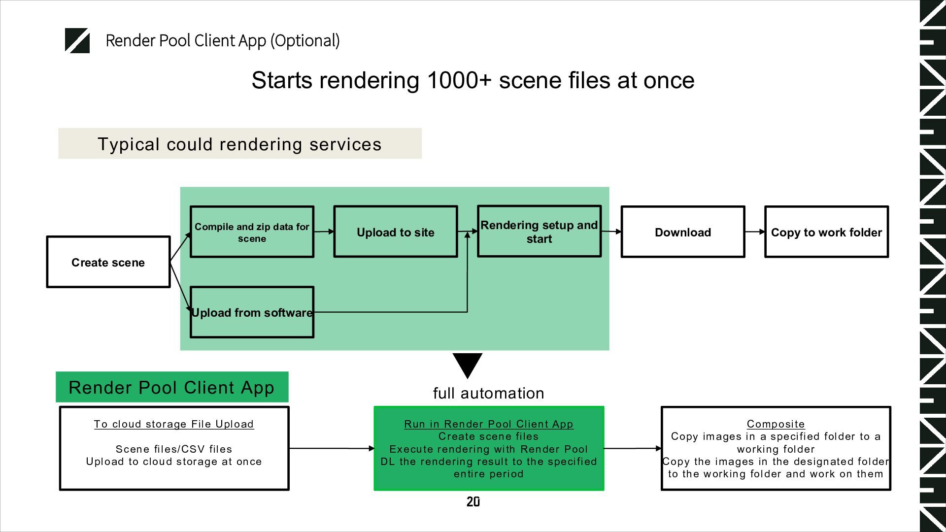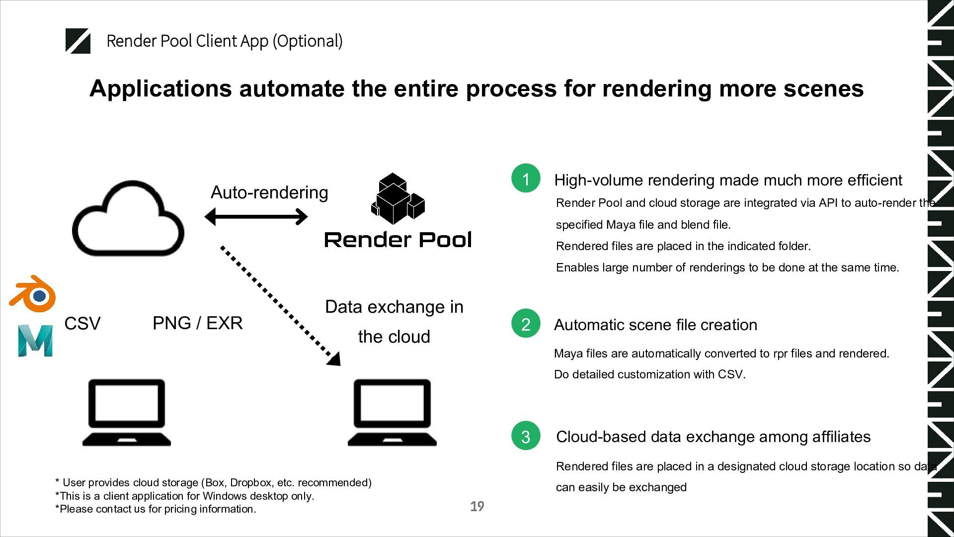 in the cloud Auto-rendering CSV 19 1 2 3 High-volume rendering made much more efficient Render Pool and cloud storage are integrated via API to auto-render the specified Maya file and blend file. Rendered files are placed in the indicated folder. Enables large number of renderings to be done at the same time. Automatic scene file creation Maya files are automatically converted to rpr files and rendered. Do detailed customization with CSV. Rendered files are placed in a designated cloud storage location so data can easily be exchanged Cloud-based data exchange among affiliates * User provides cloud storage (Box, Dropbox, etc. recommended) *This is a client application for Windows desktop only. *Please contact us for pricing information. Applications automate the entire process for rendering more scenes