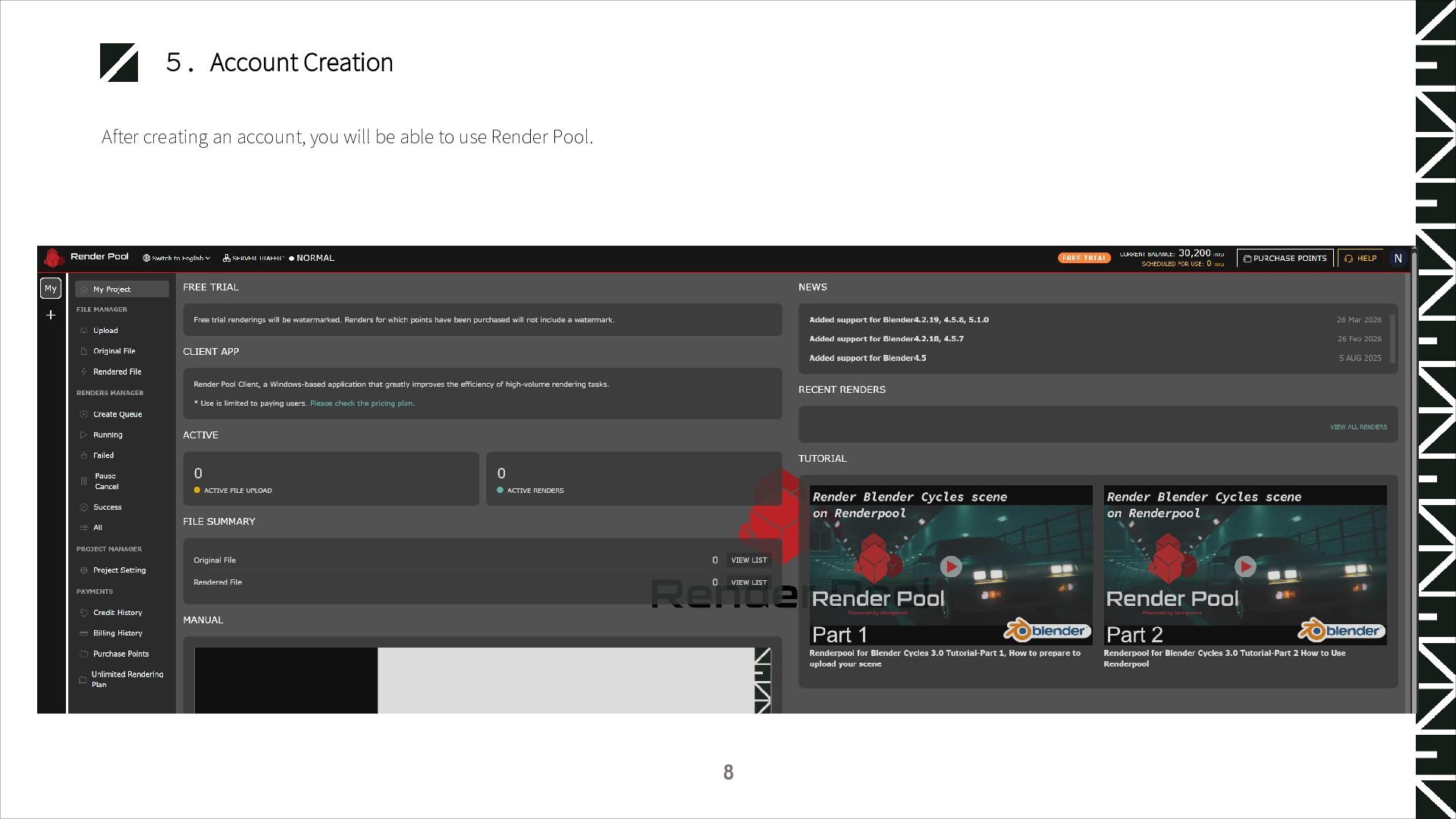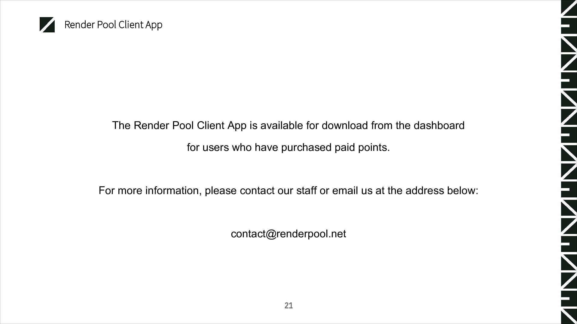 the dashboard for users who have purchased paid points. For more information, please contact our staff or email us at the address below: [email protected] 21 Render Pool Client App
