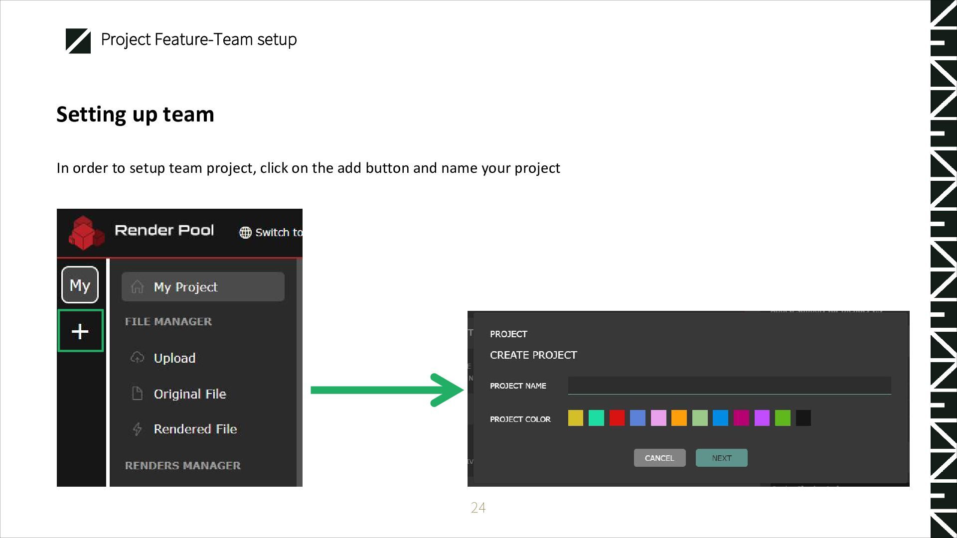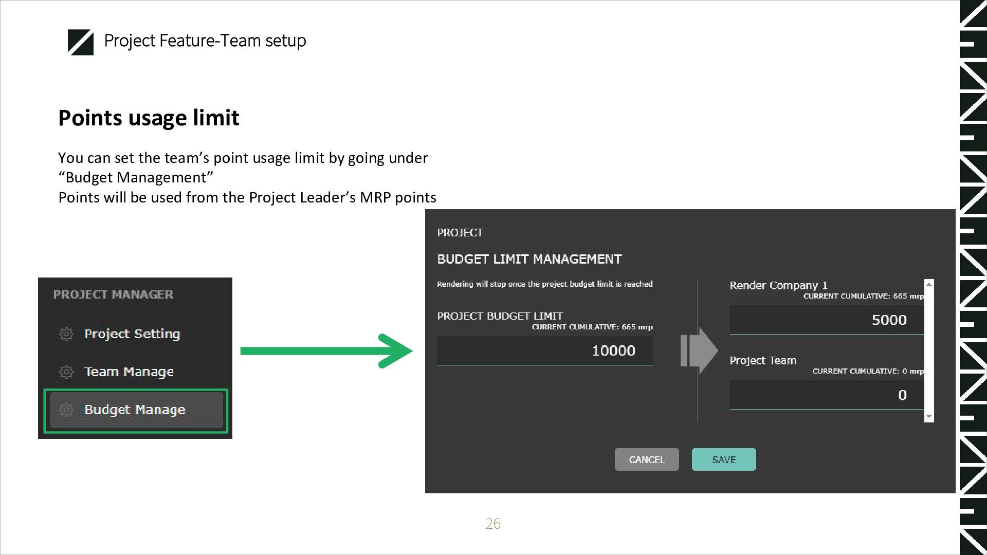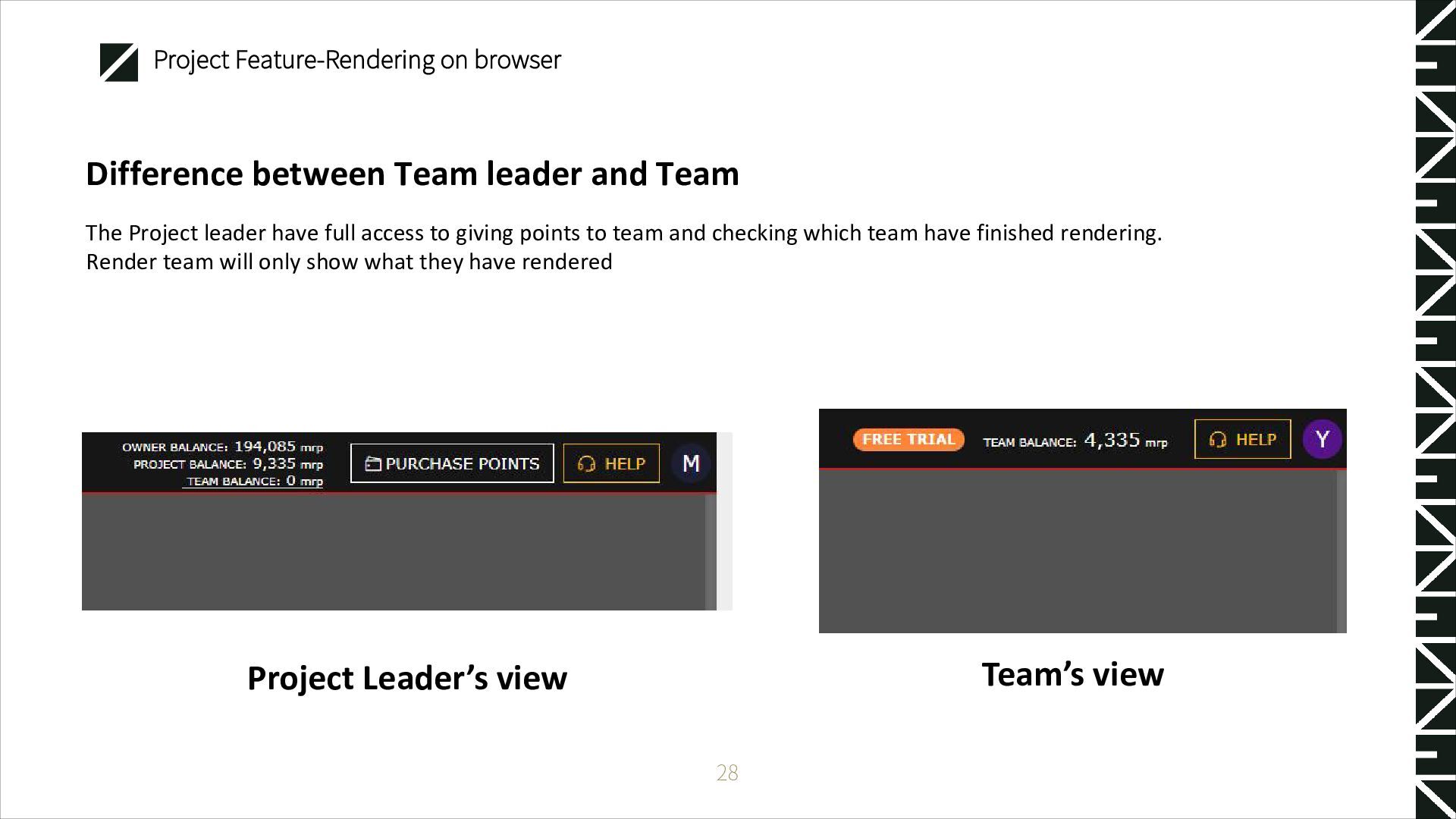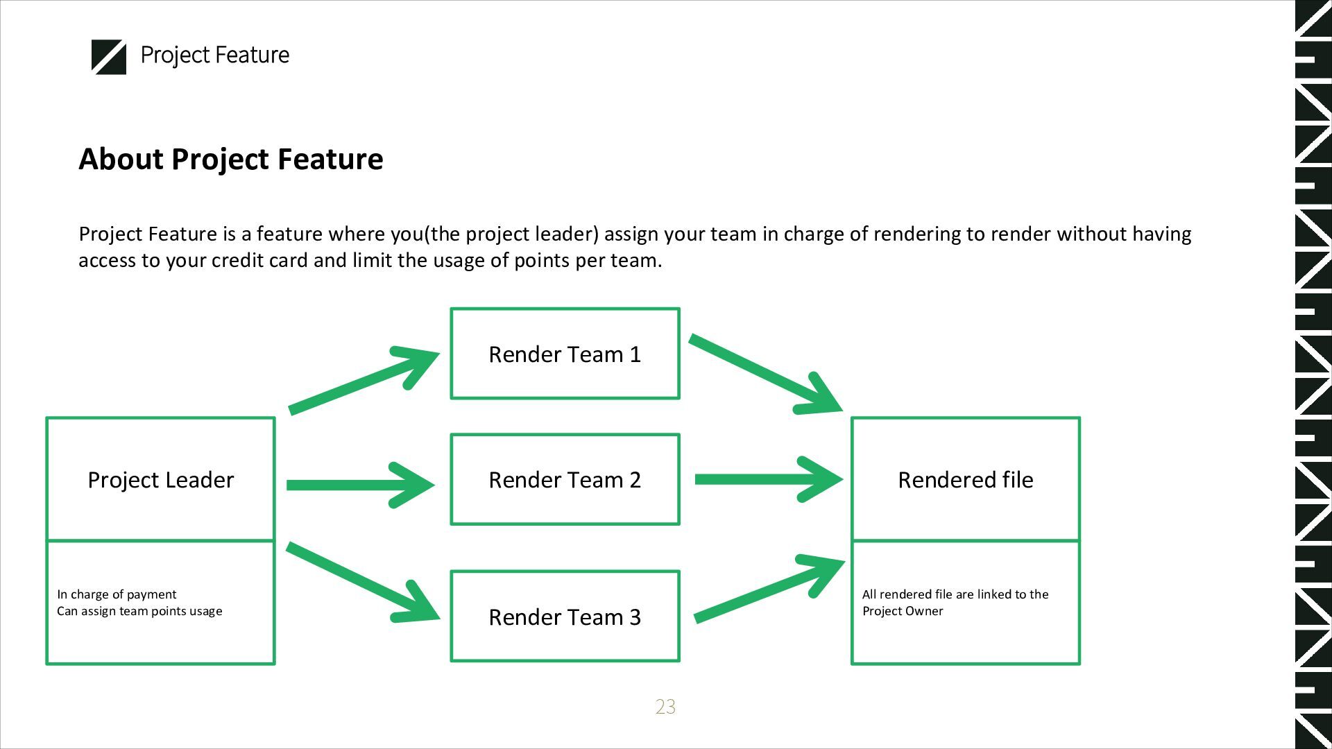 project leader) assign your team in charge of rendering to render without having access to your credit card and limit the usage of points per team. 23 Project Feature Project Leader Render Team 1 Render Team 2 Render Team 3 Rendered file In charge of payment Can assign team points usage All rendered file are linked to the Project Owner