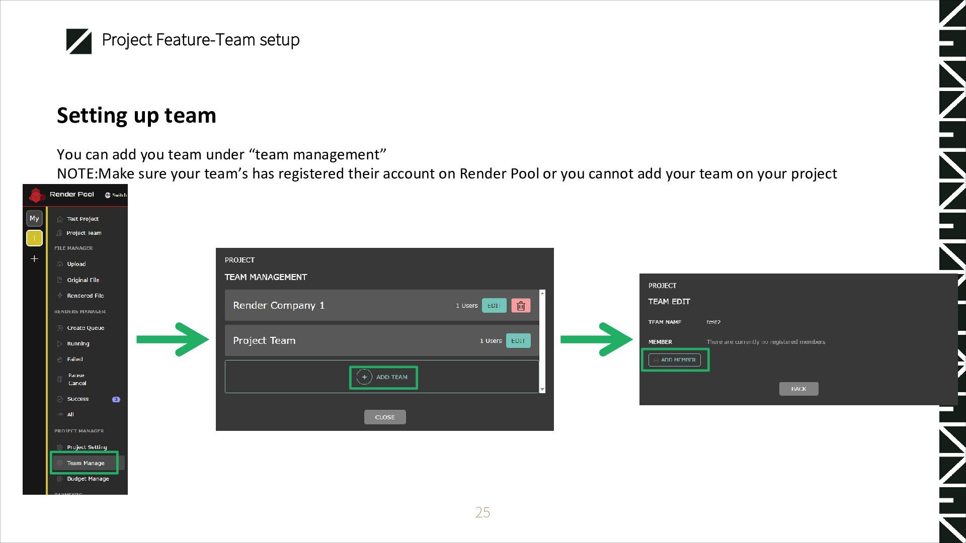 management” NOTE:Make sure your team’s has registered their account on Render Pool or you cannot add your team on your project 25 Project Feature-Team setup