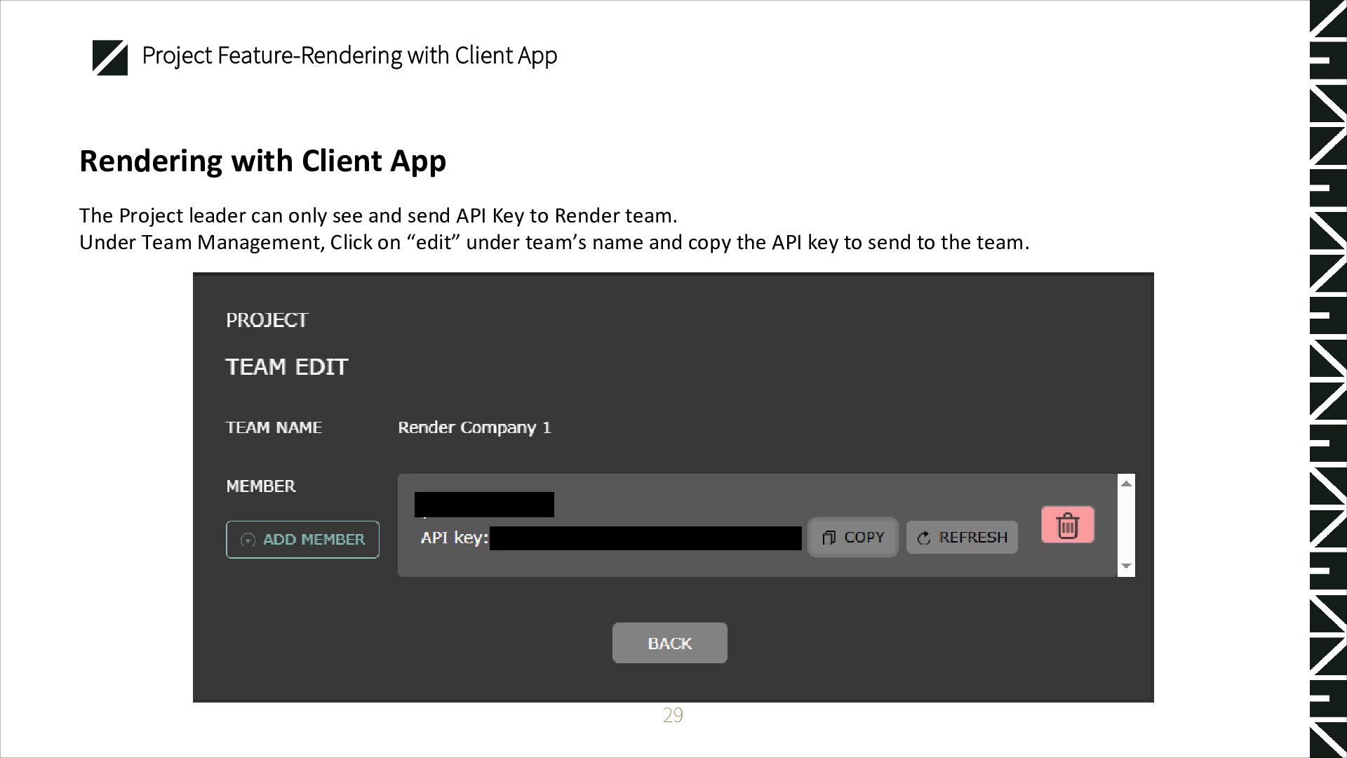 and send API Key to Render team. Under Team Management, Click on “edit” under team’s name and copy the API key to send to the team. 29 Project Feature-Rendering with Client App