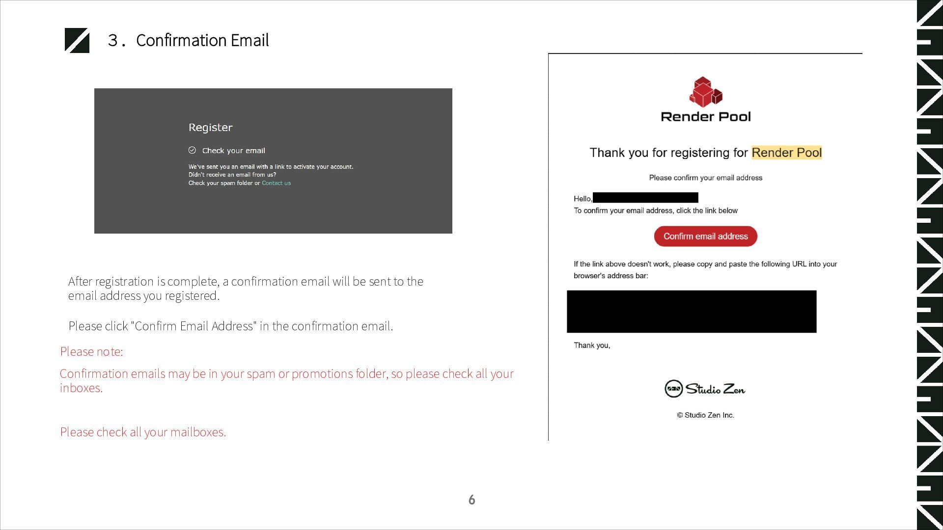 be sent to the email address you registered. Please click "Confirm Email Address" in the confirmation email. Please note: Confirmation emails may be in your spam or promotions folder, so please check all your inboxes. Please check all your mailboxes. 6
