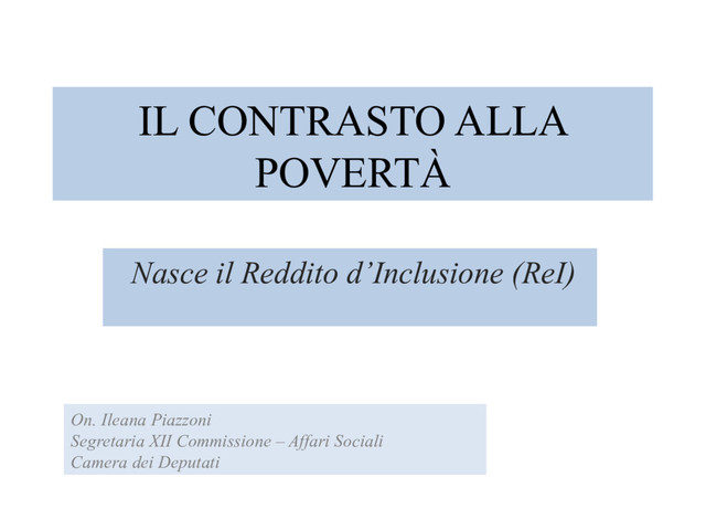n. 208/2015, il Governo ha emanato un disegno di legge delega (ddl povertà), recante norme relative al contrasto della povertà, al riordino delle prestazioni e al riordino del sistema degli interventi e dei servizi sociali. Il ddl è stato modificato e approvato dalla Camera dei Deputati il 14 luglio del 2016 ed è stato poi approvato definitivamente dal Senato il 15 marzo 2017. La legge 15 marzo 2017, n. 33 disciplina l’introduzione di una misura unica nazionale per il contrasto alla povertà, denominata Reddito di Inclusione (ReI), il riordino delle prestazioni finalizzate al contrasto della povertà e il rafforzamento del coordinamento degli interventi in materia di servizi sociali.