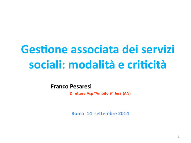 a scegliere in autonomia la forma gestionale associata più adatta che coinvolga tutti i comuni dell’ambito; Le regioni legiferino sulla materia prevedendo in modo puntuale un ampio spettro di possibilità (ASP, unioni, convenzioni, aziende consortili, ecc.) che gli enti locali potranno scegliere (importante perché non c’è più l’elenco dell’art. 113bis del Tuel). 2. La forma gestionale prescelta deve mantenere in capo ai comuni il potere di indirizzo politico e di controllo diretto. 3. Risolvere i problemi segnalati nelle slides precedenti. Un quadro normativo nazionale adeguato. 4. Incentivare finanziariamente gli Ambiti sociali che realizzano la gestione associata.