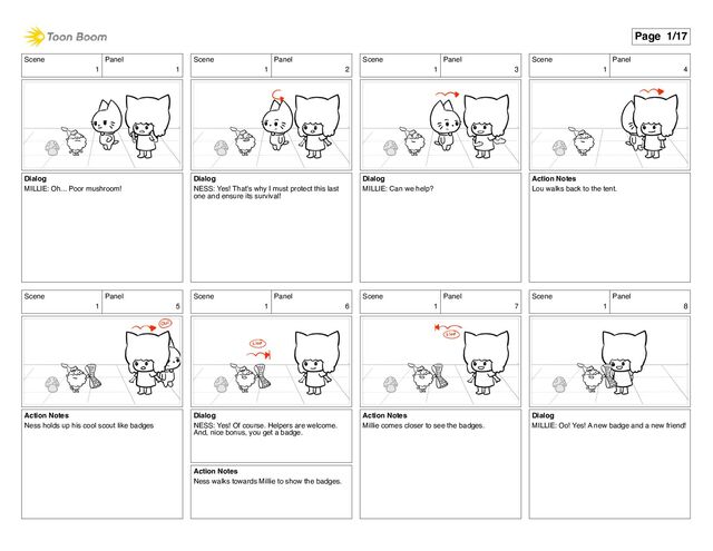 Panel 8 Dialog NESS: Helper Millie! Let's get to work now. Scene 8 Panel 9 Dialog NESS: No hanging around with lazy loafers! Scene 8 Panel 10 Scene 9 Panel 1 Dialog LOU: (ironic) That's right Millie! Scene 9 Panel 2 Dialog LOU: Time to hang around with mushroom maniacs instead. Scene 9 Panel 3 Page 8/17
