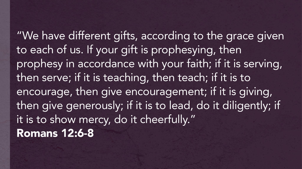 each of us. If your gift is prophesying, then prophesy in accordance with your faith; if it is serving, then serve; if it is teaching, then teach; if it is to encourage, then give encouragement; if it is giving, then give generously; if it is to lead, do it diligently; if it is to show mercy, do it cheerfully.” Romans 12:6-8
