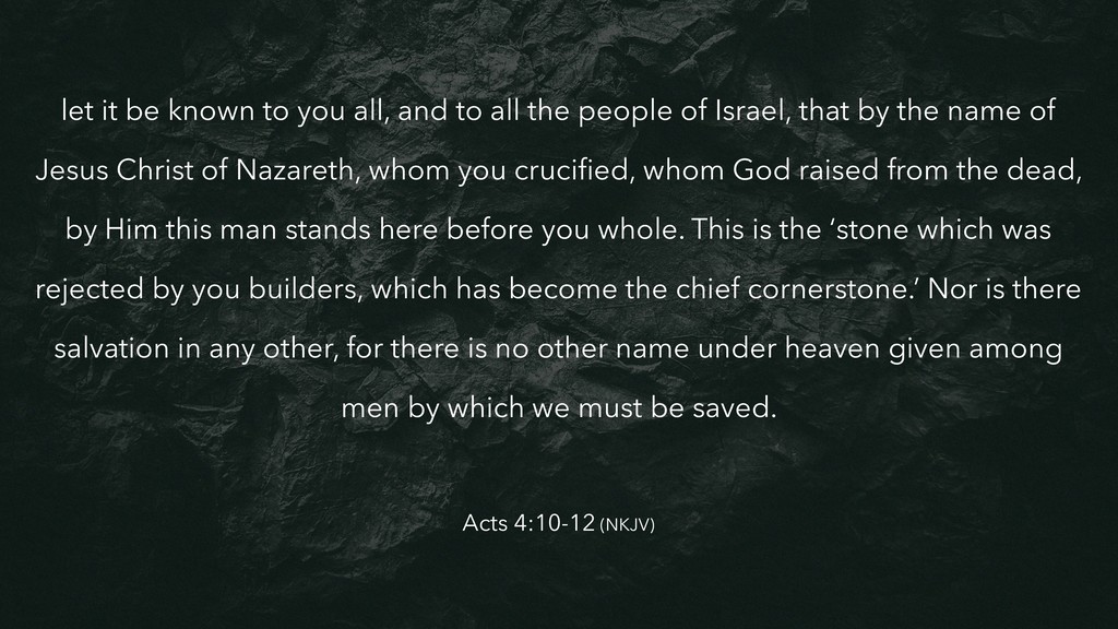 the people of Israel, that by the name of Jesus Christ of Nazareth, whom you crucified, whom God raised from the dead, by Him this man stands here before you whole. This is the ‘stone which was rejected by you builders, which has become the chief cornerstone.’ Nor is there salvation in any other, for there is no other name under heaven given among men by which we must be saved. Acts 4:10-12 (NKJV)