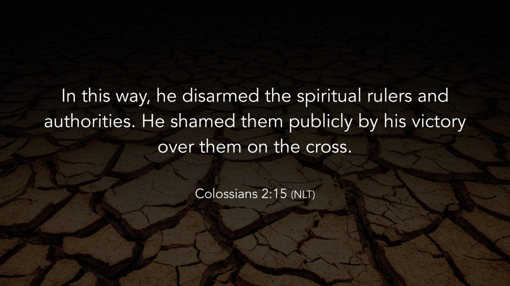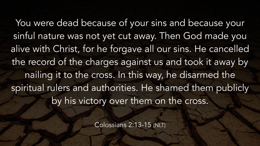 sinful nature was not yet cut away. Then God made you alive with Christ, for he forgave all our sins. He cancelled the record of the charges against us and took it away by nailing it to the cross. In this way, he disarmed the spiritual rulers and authorities. He shamed them publicly by his victory over them on the cross. Colossians 2:13-15 (NLT)