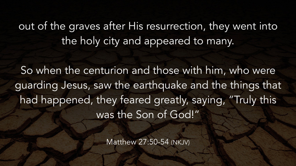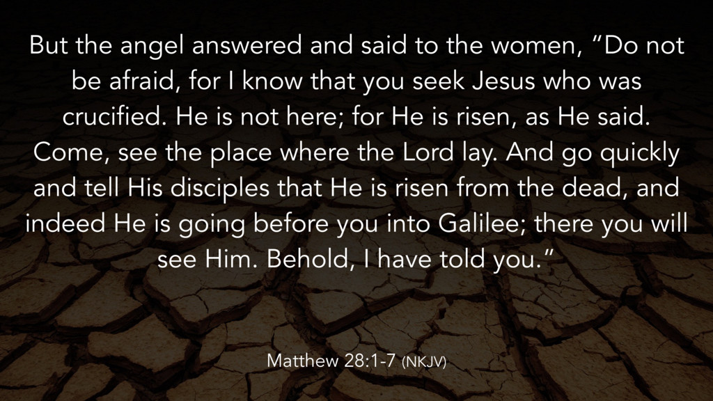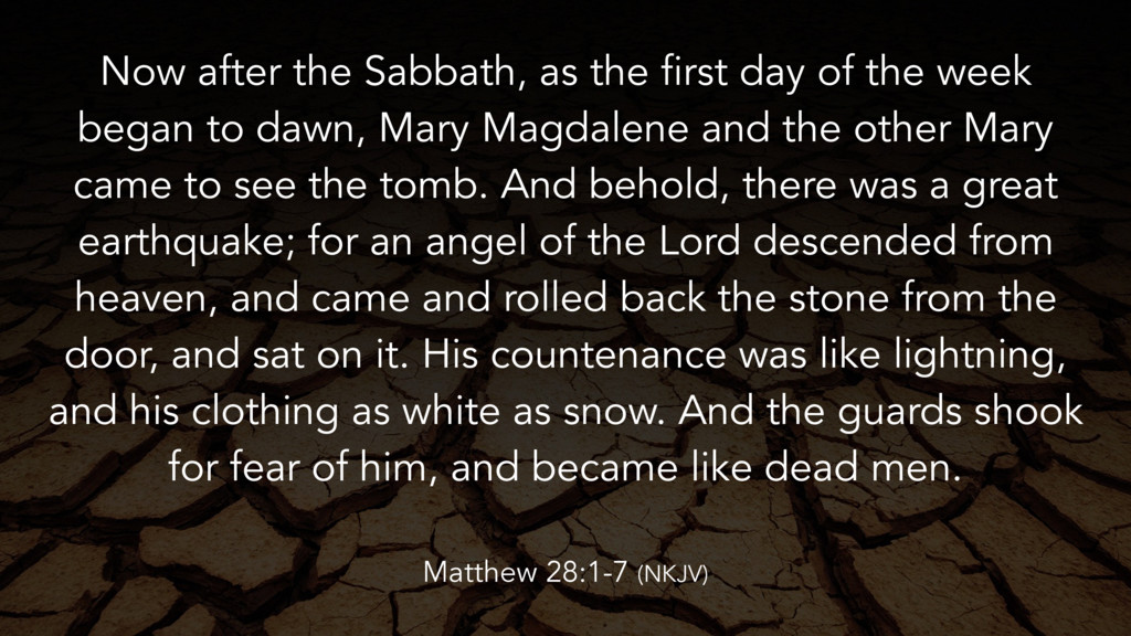 week began to dawn, Mary Magdalene and the other Mary came to see the tomb. And behold, there was a great earthquake; for an angel of the Lord descended from heaven, and came and rolled back the stone from the door, and sat on it. His countenance was like lightning, and his clothing as white as snow. And the guards shook for fear of him, and became like dead men. Matthew 28:1-7 (NKJV)