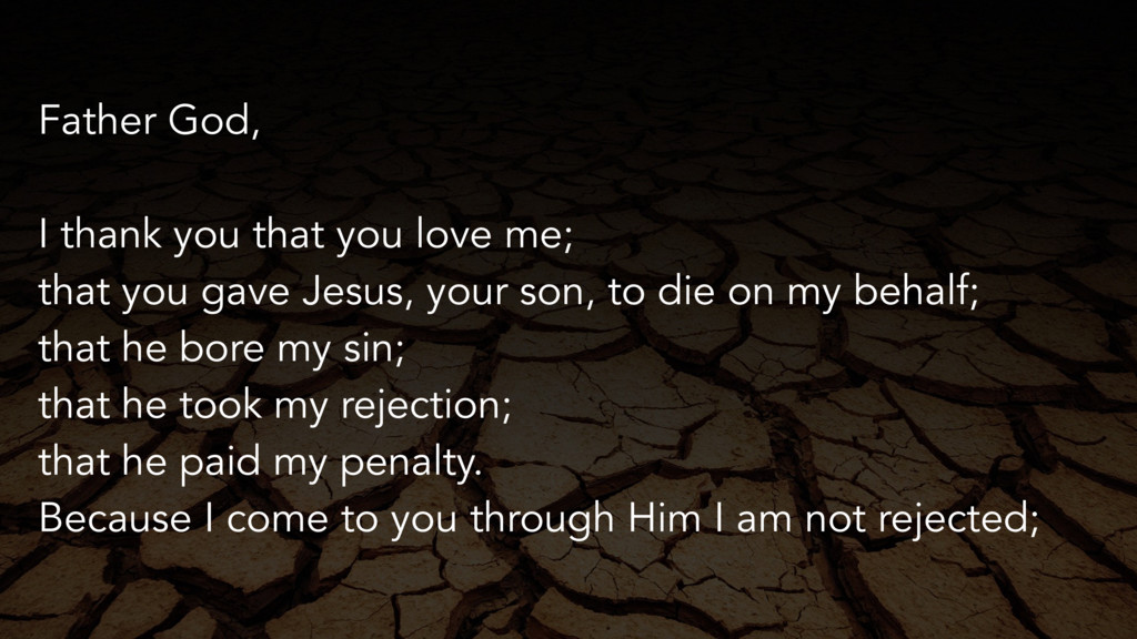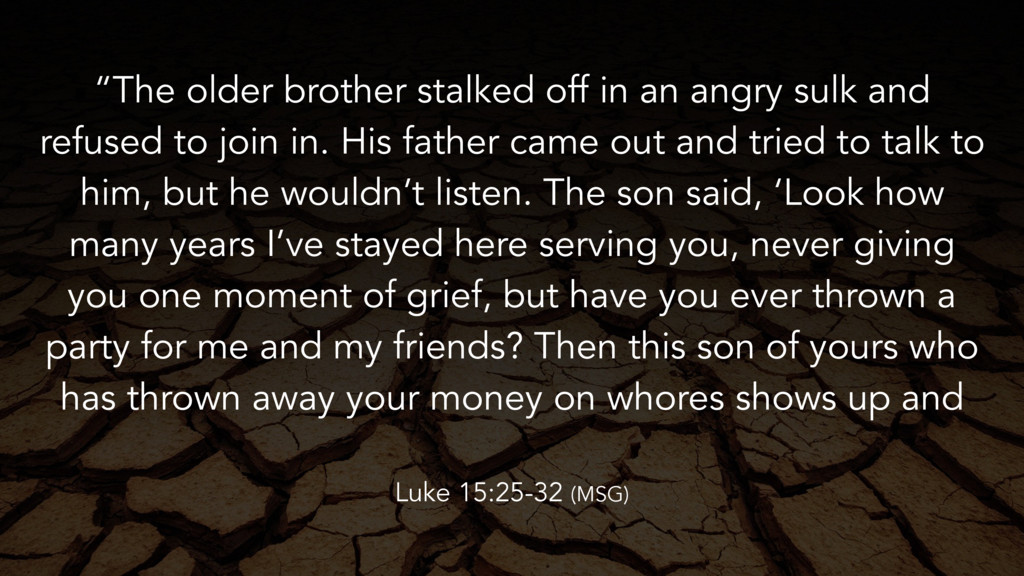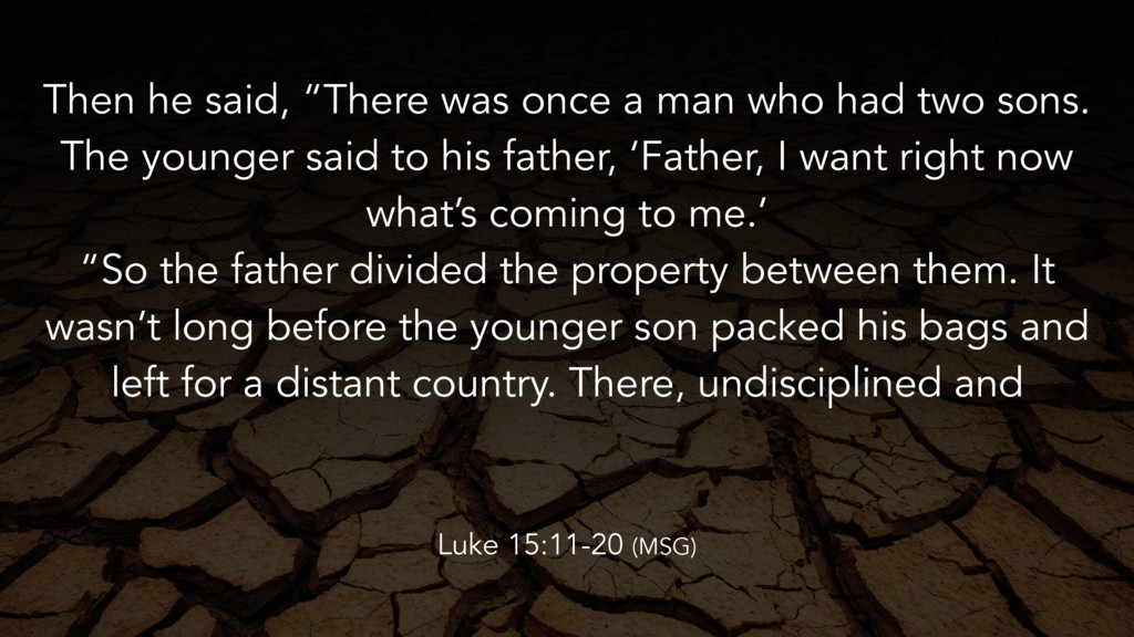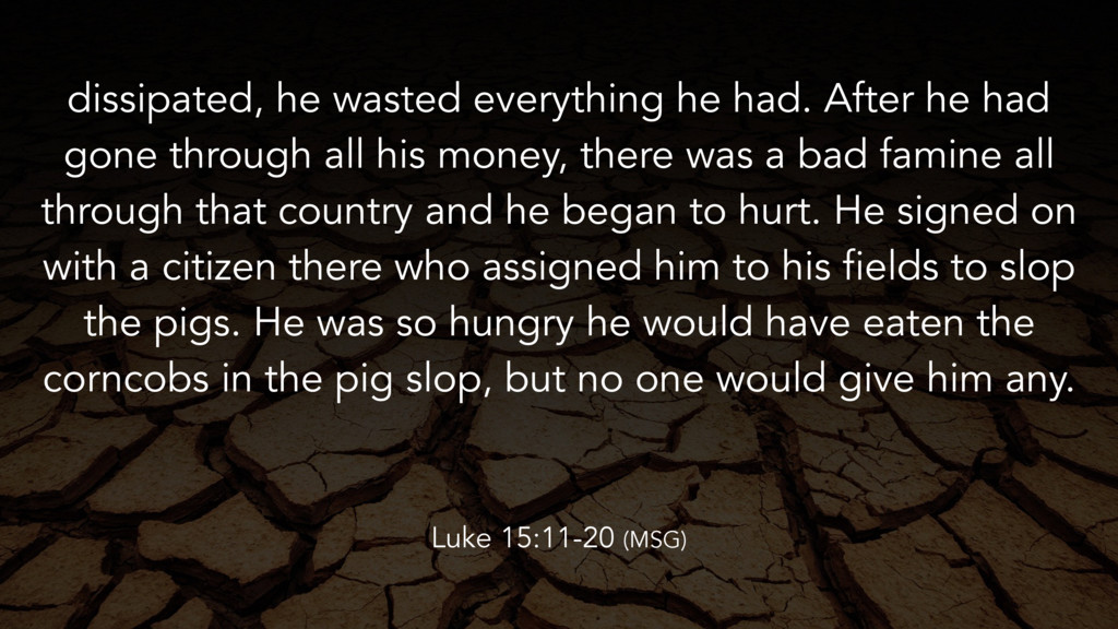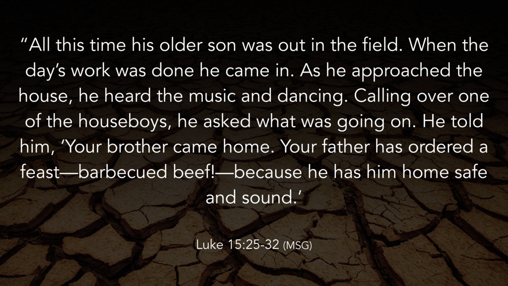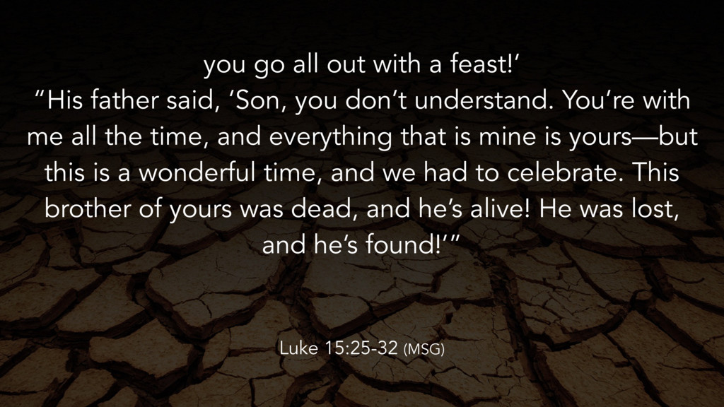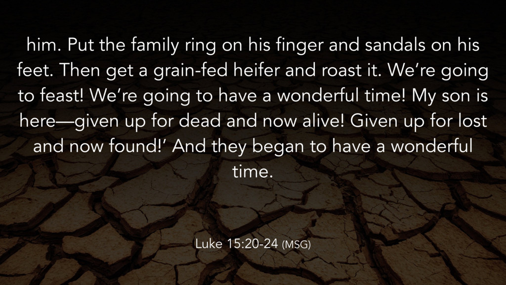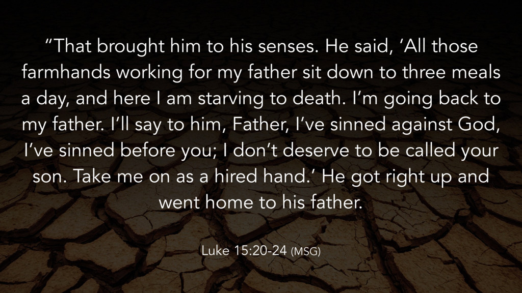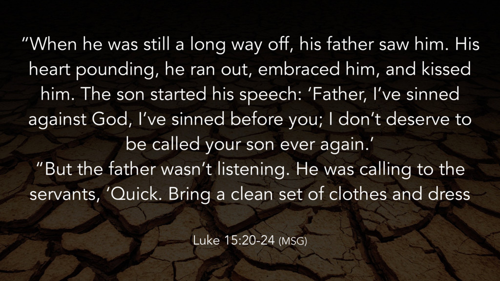 saw him. His heart pounding, he ran out, embraced him, and kissed him. The son started his speech: ‘Father, I’ve sinned against God, I’ve sinned before you; I don’t deserve to be called your son ever again.’ “But the father wasn’t listening. He was calling to the servants, ‘Quick. Bring a clean set of clothes and dress Luke 15:20-24 (MSG)