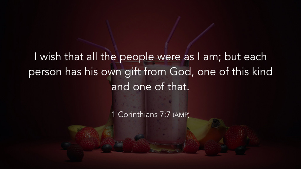 but each person has his own gift from God, one of this kind and one of that. 1 Corinthians 7:7 (AMP)