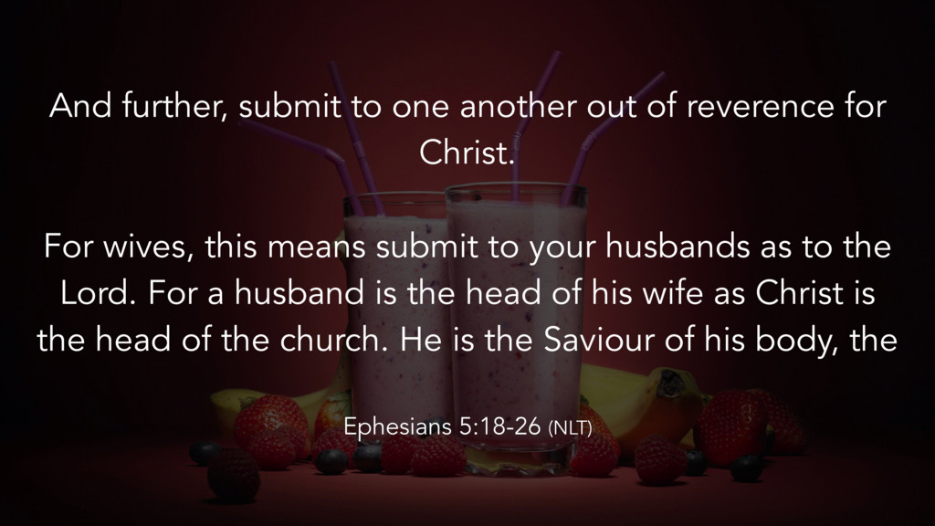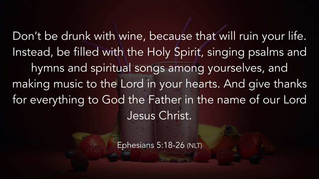 life. Instead, be filled with the Holy Spirit, singing psalms and hymns and spiritual songs among yourselves, and making music to the Lord in your hearts. And give thanks for everything to God the Father in the name of our Lord Jesus Christ. Ephesians 5:18-26 (NLT)