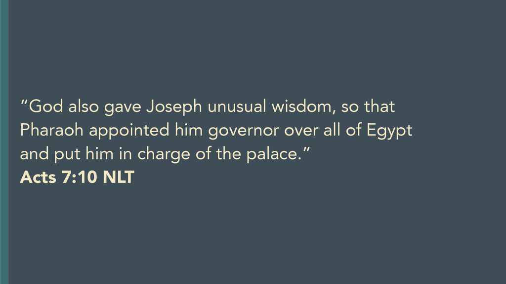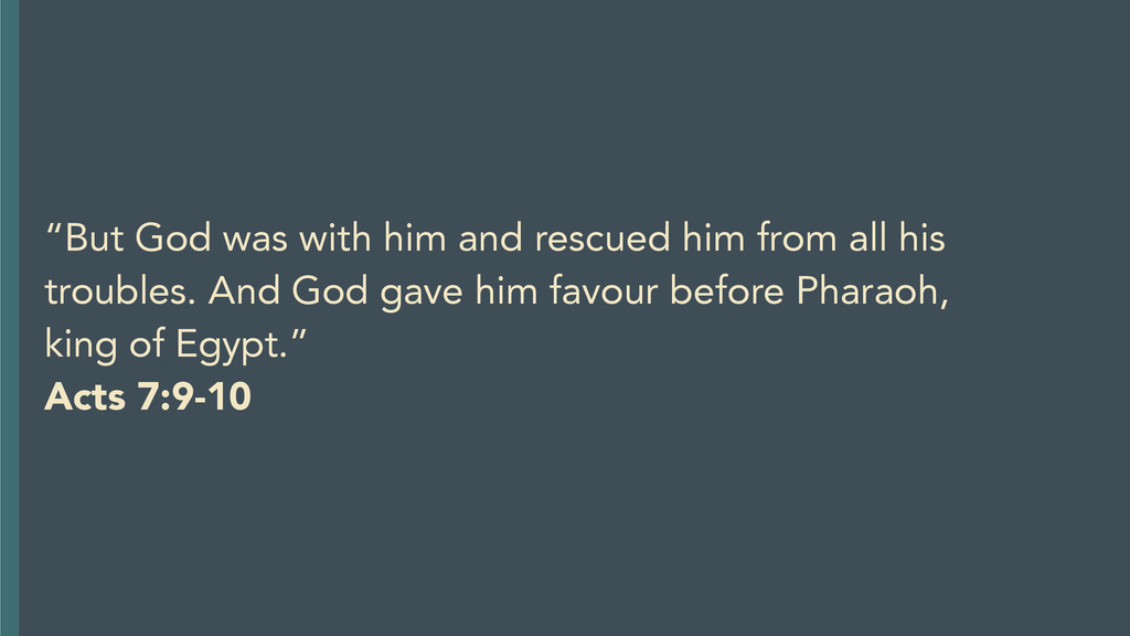 sold him to be a slave in Egypt. But God was with him and rescued him from all his troubles. And God gave him favour before Pharaoh, king of Egypt. God also gave Joseph unusual wisdom, so that Pharaoh appointed him governor over all of Egypt and put him in charge of the palace.” Acts 7:9-10