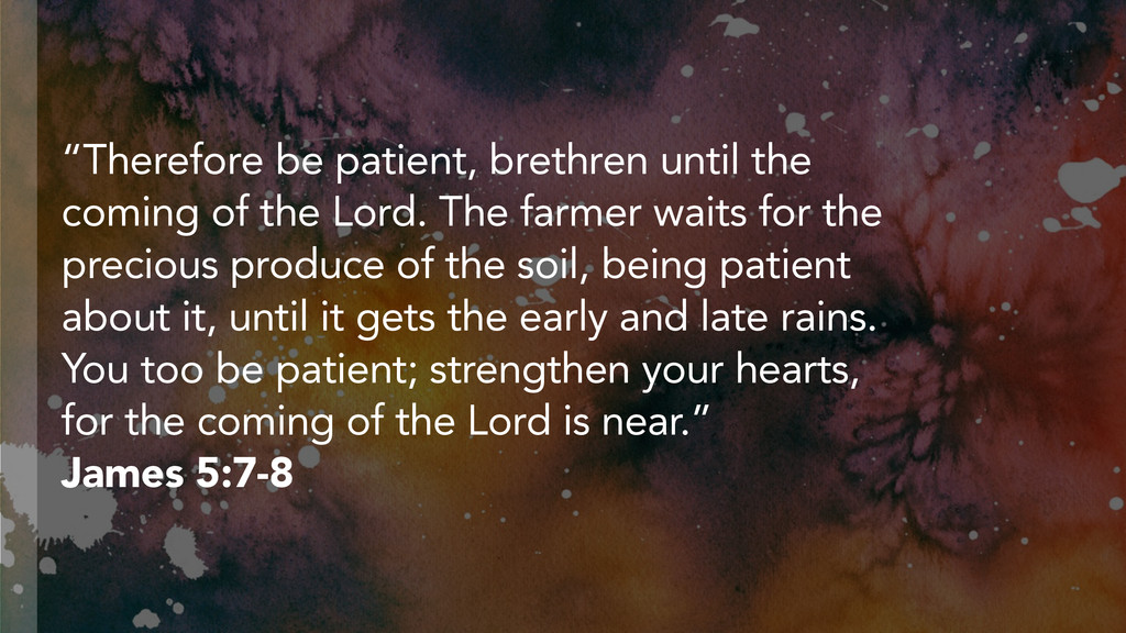 The farmer waits for the precious produce of the soil, being patient about it, until it gets the early and late rains. You too be patient; strengthen your hearts, for the coming of the Lord is near.” James 5:7-8