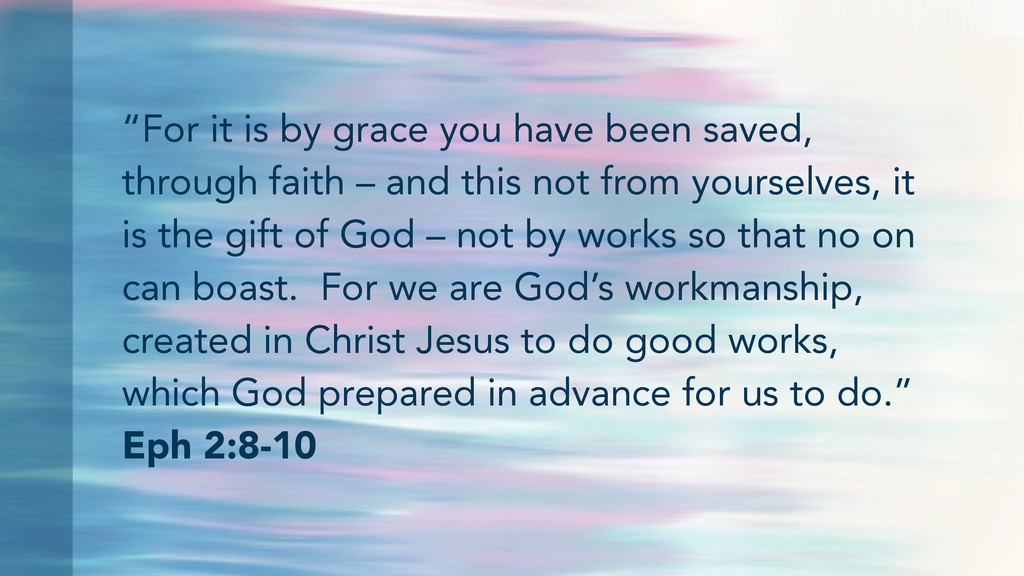 faith – and this not from yourselves, it is the gift of God – not by works so that no on can boast. For we are God’s workmanship, created in Christ Jesus to do good works, which God prepared in advance for us to do.” Eph 2:8-10