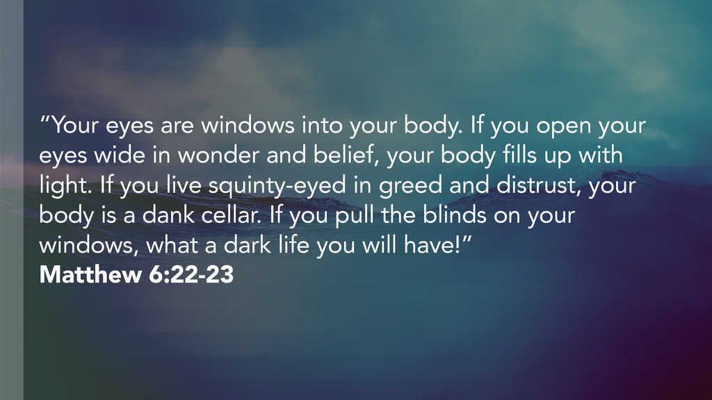 your eyes wide in wonder and belief, your body fills up with light. If you live squinty-eyed in greed and distrust, your body is a dank cellar. If you pull the blinds on your windows, what a dark life you will have!” Matthew 6:22-23