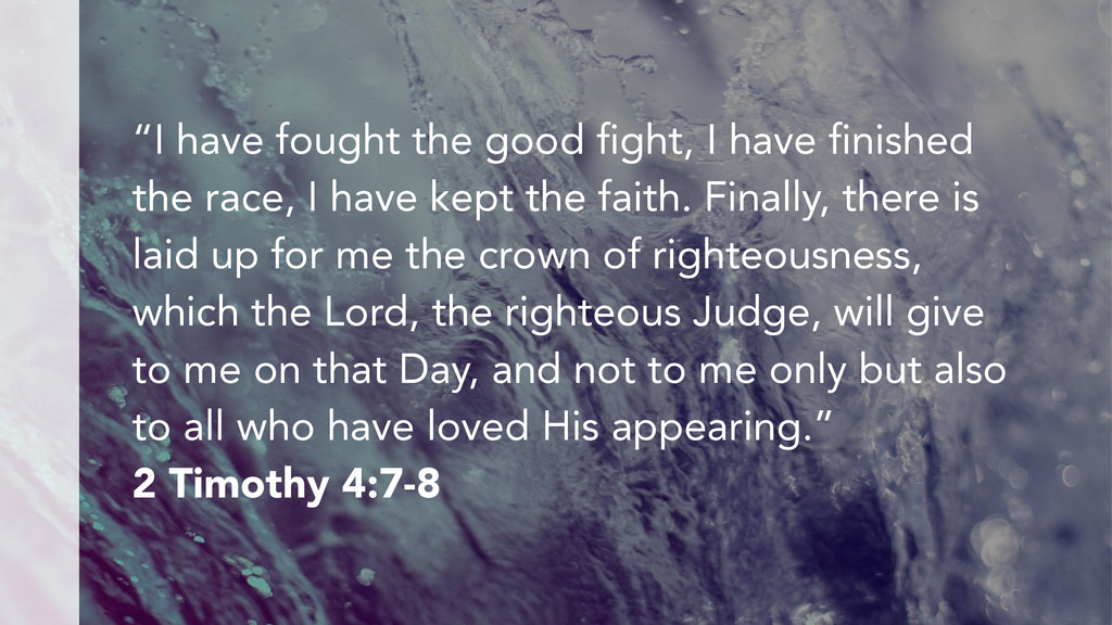 race, I have kept the faith. Finally, there is laid up for me the crown of righteousness, which the Lord, the righteous Judge, will give to me on that Day, and not to me only but also to all who have loved His appearing.” 2 Timothy 4:7-8
