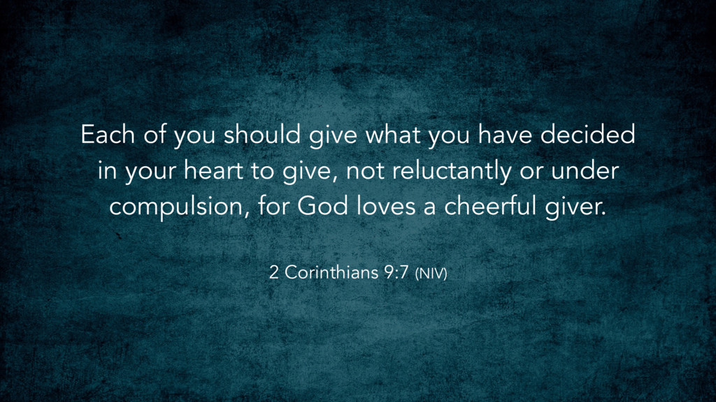 your heart to give, not reluctantly or under compulsion, for God loves a cheerful giver. 2 Corinthians 9:7 (NIV)