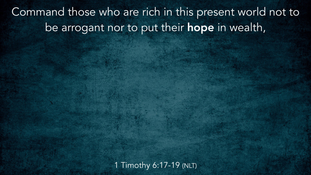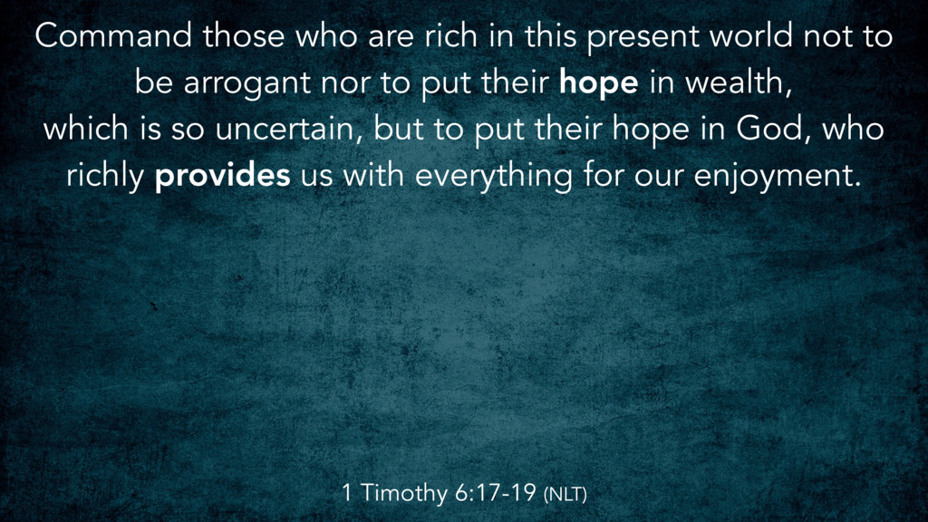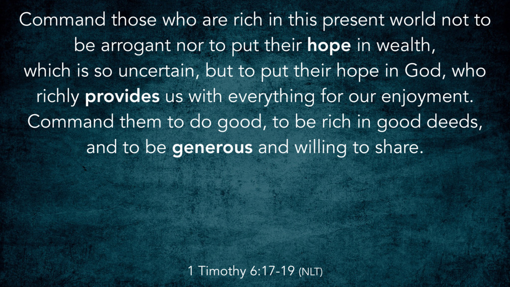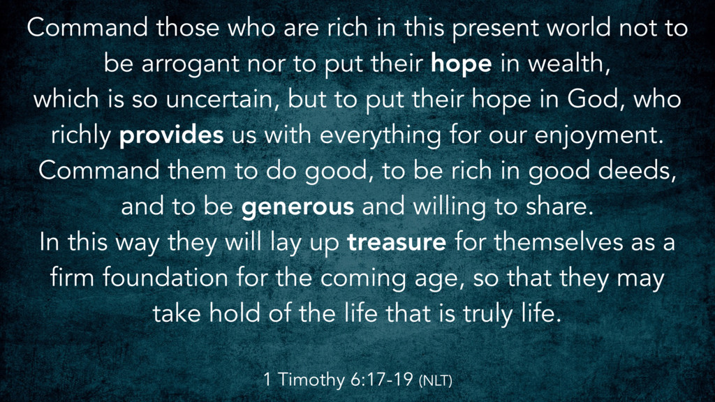 to be arrogant nor to put their hope in wealth, which is so uncertain, but to put their hope in God, who richly provides us with everything for our enjoyment. Command them to do good, to be rich in good deeds, and to be generous and willing to share. In this way they will lay up treasure for themselves as a firm foundation for the coming age, so that they may take hold of the life that is truly life. 1 Timothy 6:17-19 (NLT)