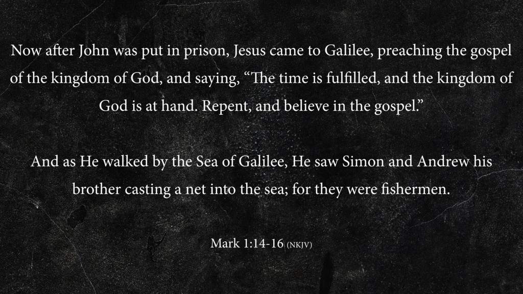 Galilee, preaching the gospel of the kingdom of God, and saying, “The time is fulfilled, and the kingdom of God is at hand. Repent, and believe in the gospel.” And as He walked by the Sea of Galilee, He saw Simon and Andrew his brother casting a net into the sea; for they were fishermen. Mark 1:14-16 (NKJV)