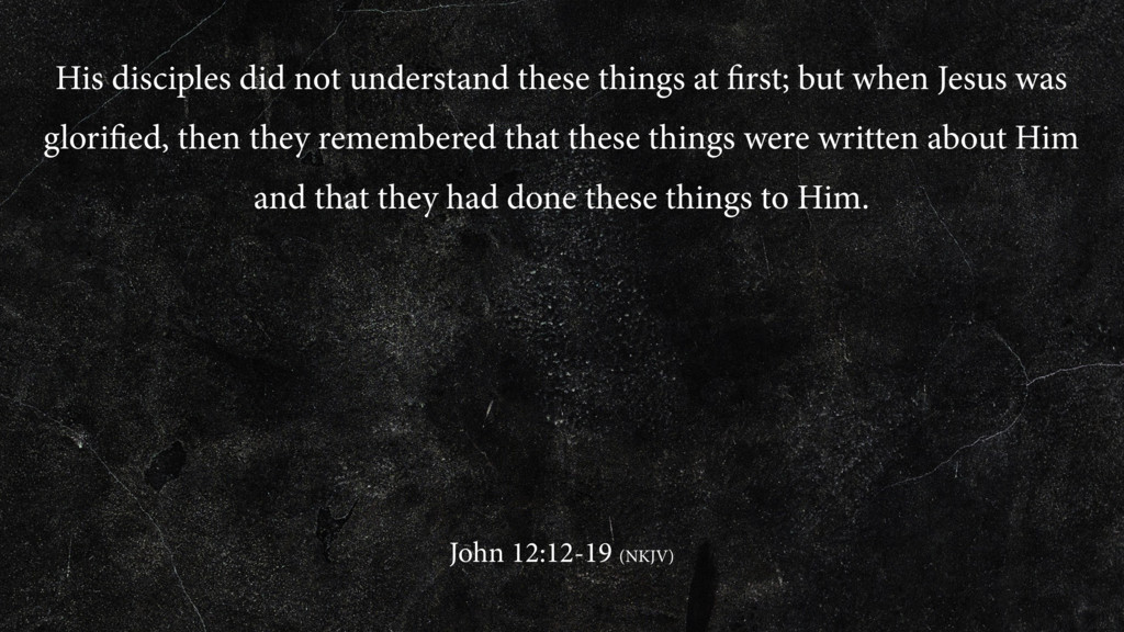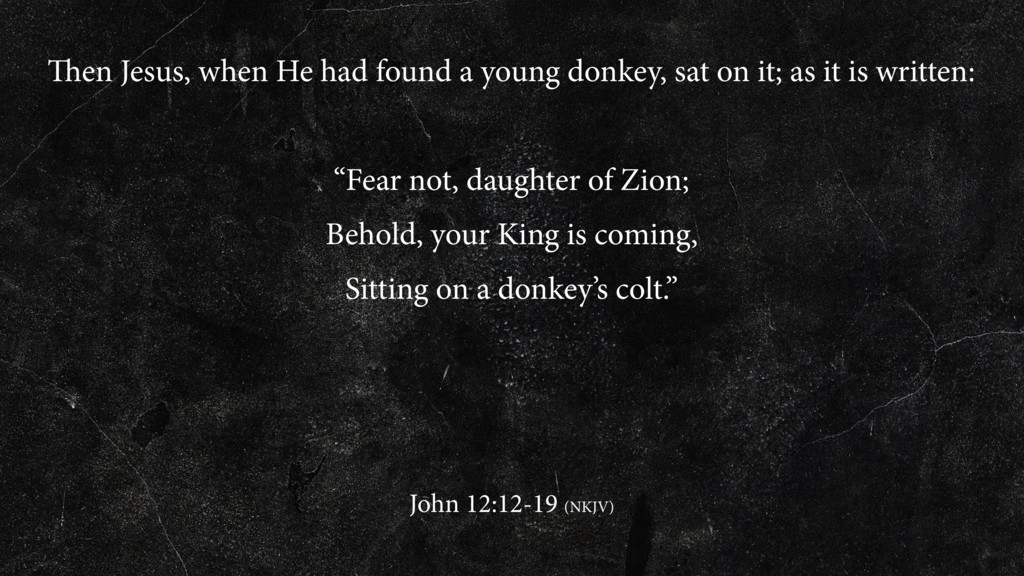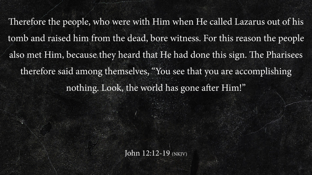 Lazarus out of his tomb and raised him from the dead, bore witness. For this reason the people also met Him, because they heard that He had done this sign. The Pharisees therefore said among themselves, “You see that you are accomplishing nothing. Look, the world has gone after Him!” John 12:12-19 (NKJV)