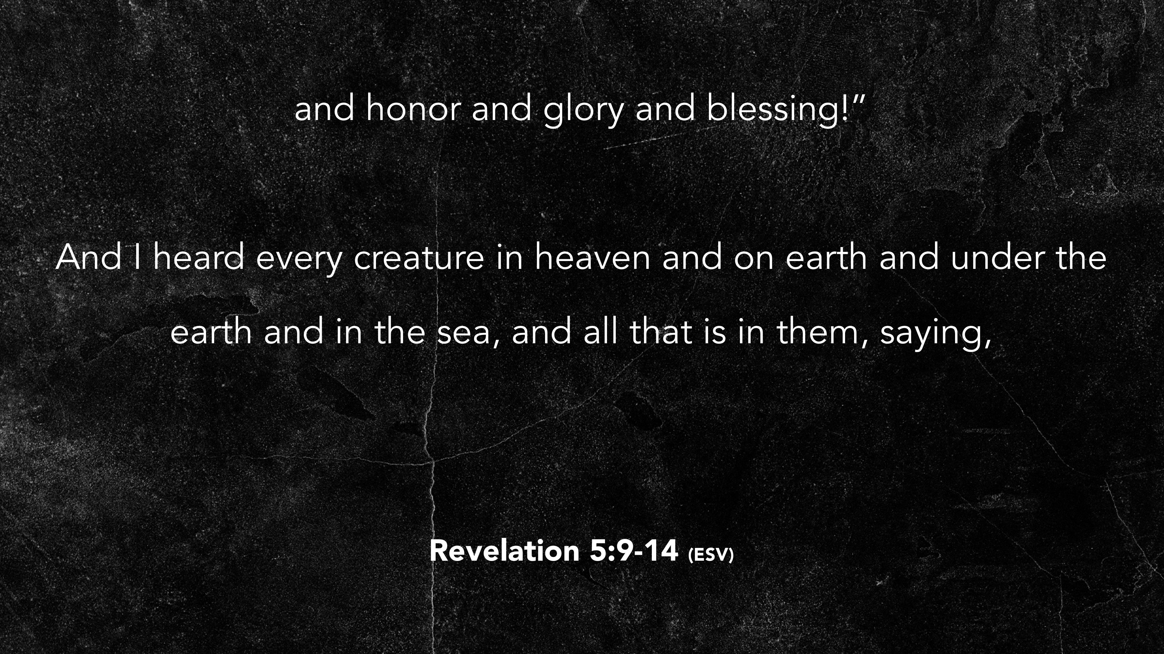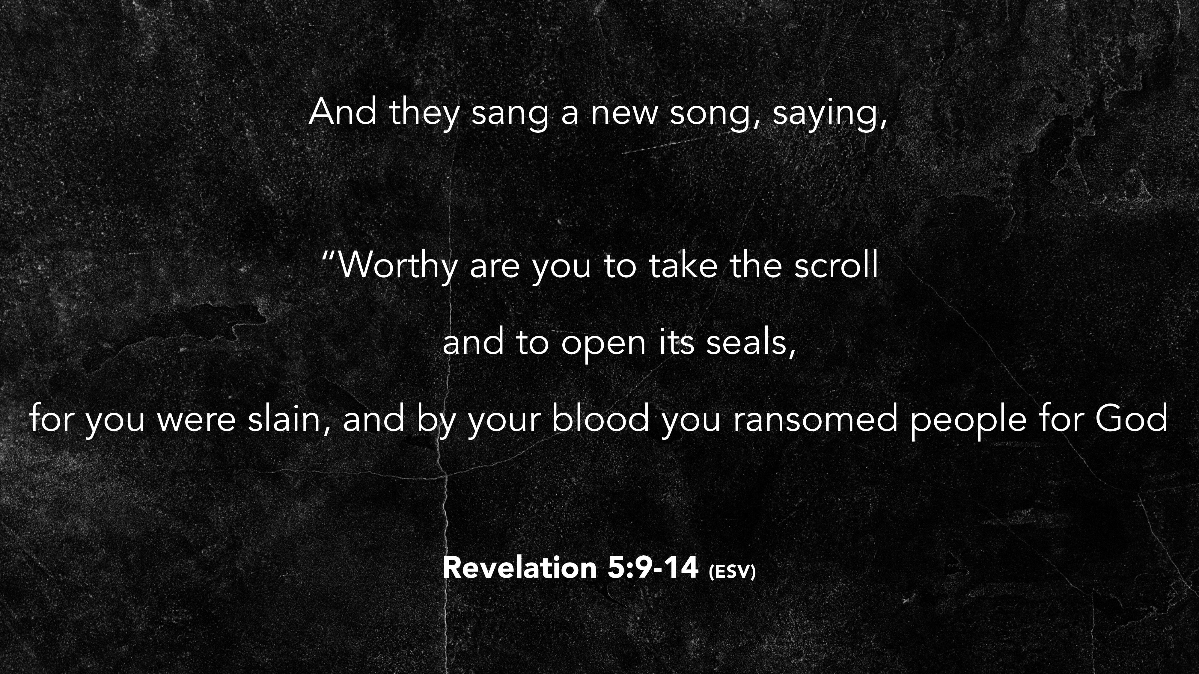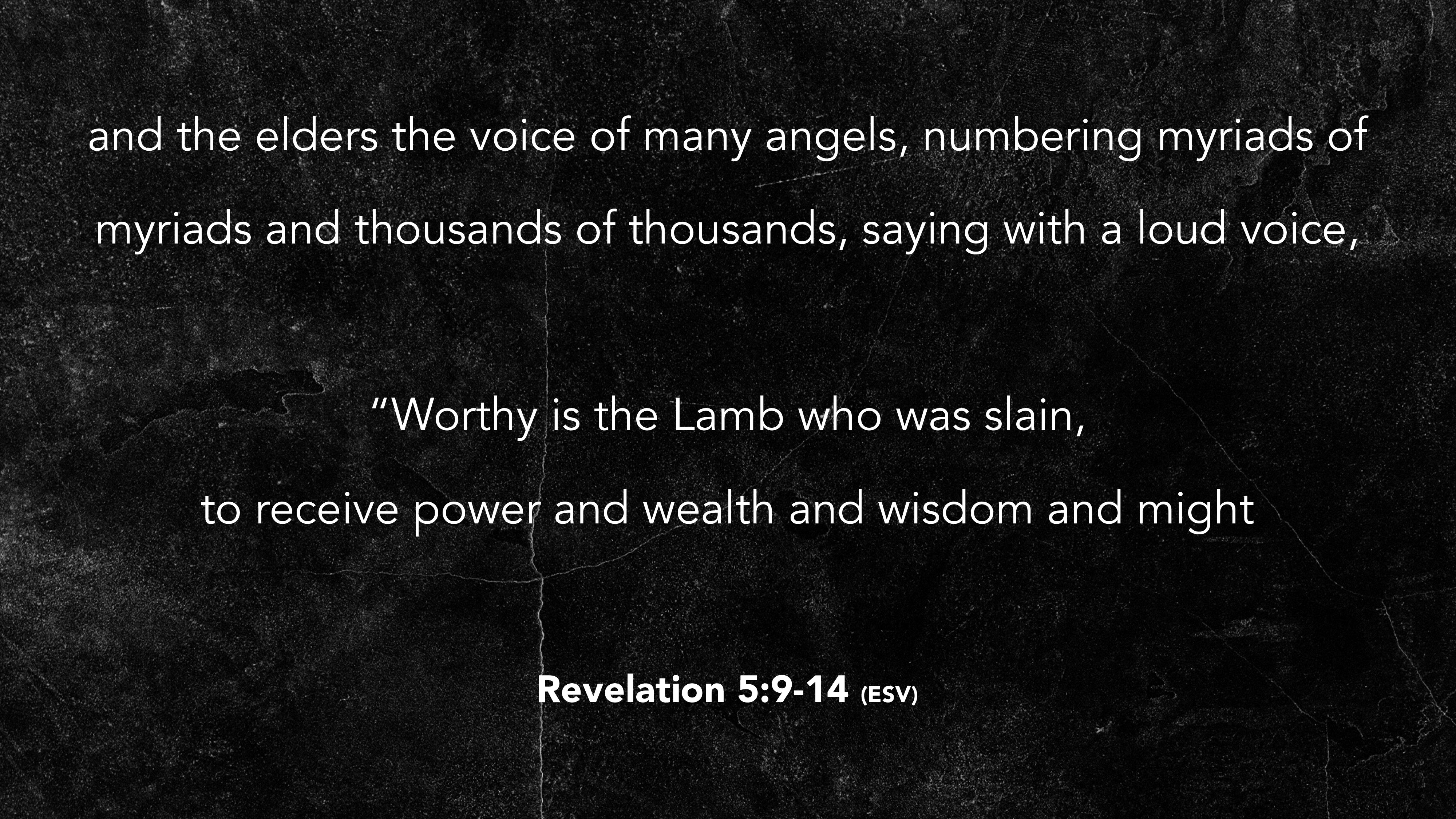 of myriads and thousands of thousands, saying with a loud voice, “Worthy is the Lamb who was slain, to receive power and wealth and wisdom and might Revelation 5:9-14 (ESV)