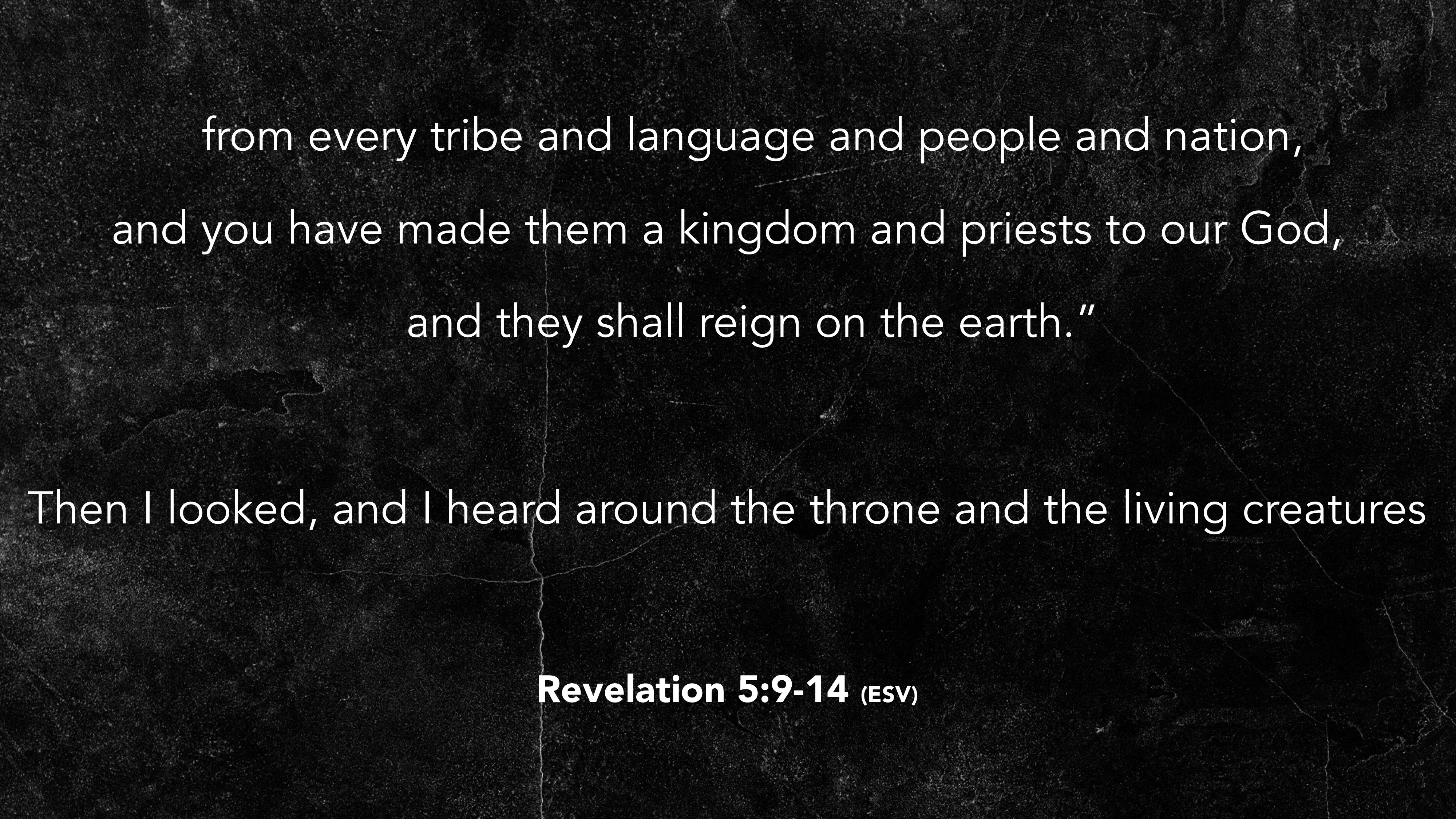 you have made them a kingdom and priests to our God, and they shall reign on the earth.” Then I looked, and I heard around the throne and the living creatures Revelation 5:9-14 (ESV)