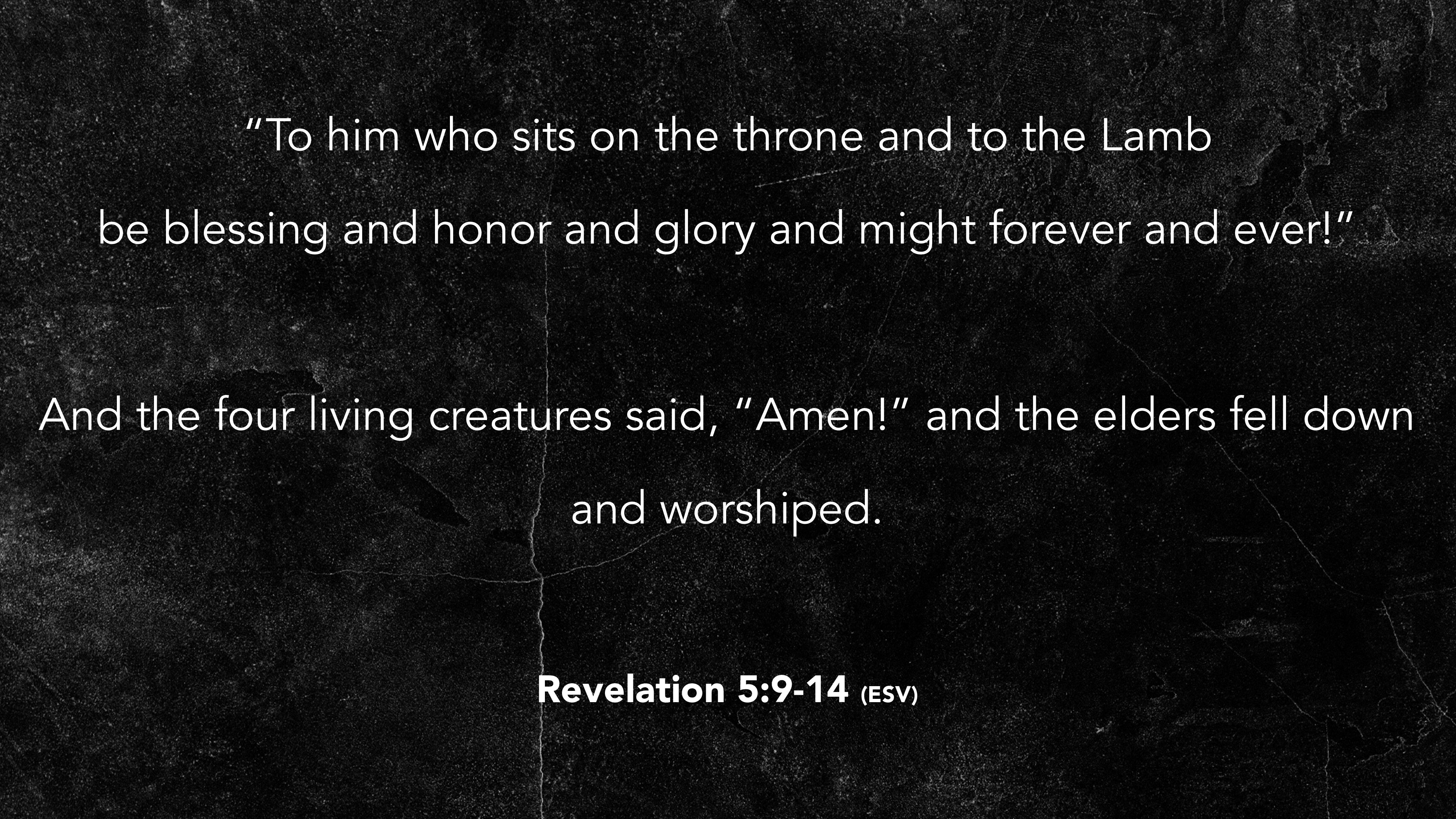 Lamb be blessing and honor and glory and might forever and ever!” And the four living creatures said, “Amen!” and the elders fell down and worshiped. Revelation 5:9-14 (ESV)