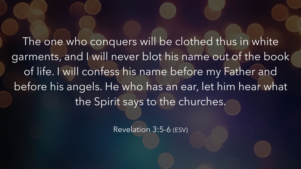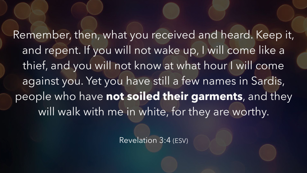 repent. If you will not wake up, I will come like a thief, and you will not know at what hour I will come against you. Yet you have still a few names in Sardis, people who have not soiled their garments, and they will walk with me in white, for they are worthy. Revelation 3:4 (ESV)