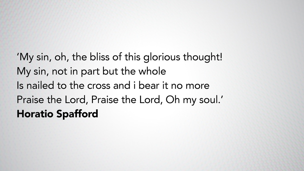 sin, not in part but the whole Is nailed to the cross and i bear it no more Praise the Lord, Praise the Lord, Oh my soul.’ Horatio Spafford