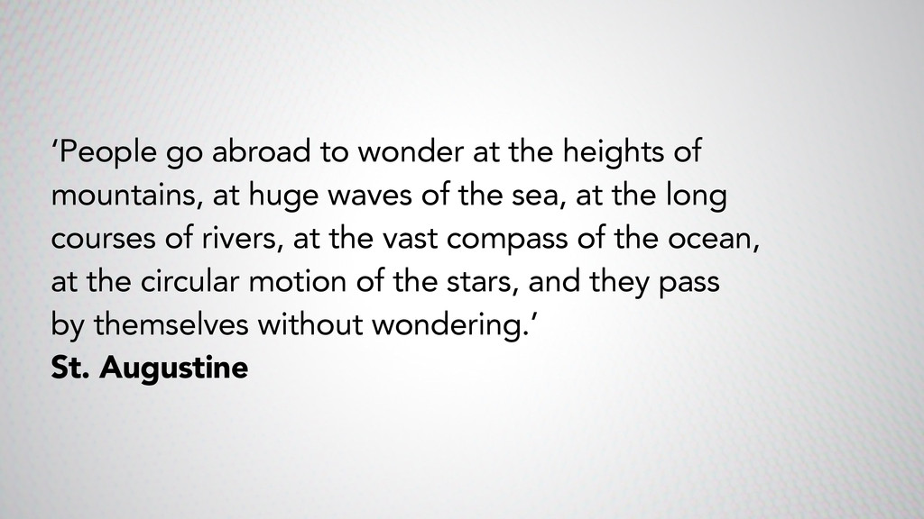 at huge waves of the sea, at the long courses of rivers, at the vast compass of the ocean, at the circular motion of the stars, and they pass by themselves without wondering.’ St. Augustine