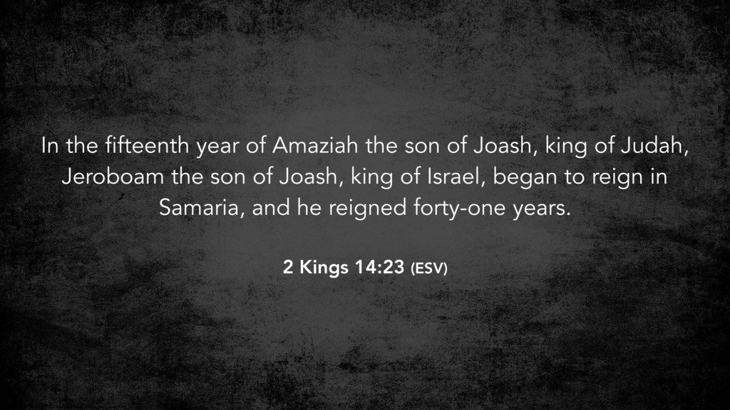 king of Judah, Jeroboam the son of Joash, king of Israel, began to reign in Samaria, and he reigned forty-one years. 2 Kings 14:23 (ESV)
