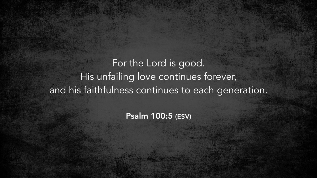 and his faithfulness continues to each generation. Psalm 100:5 (ESV)