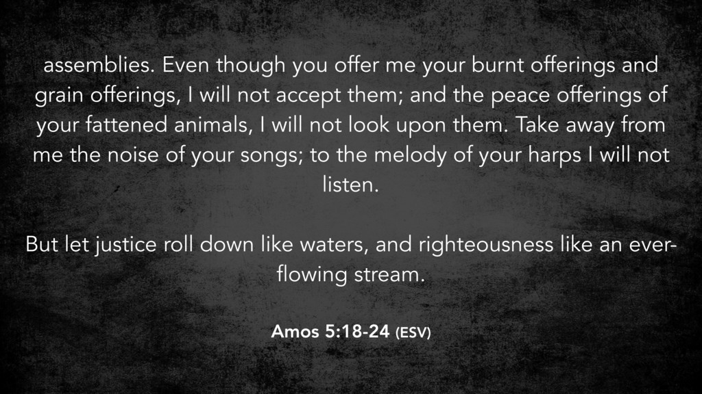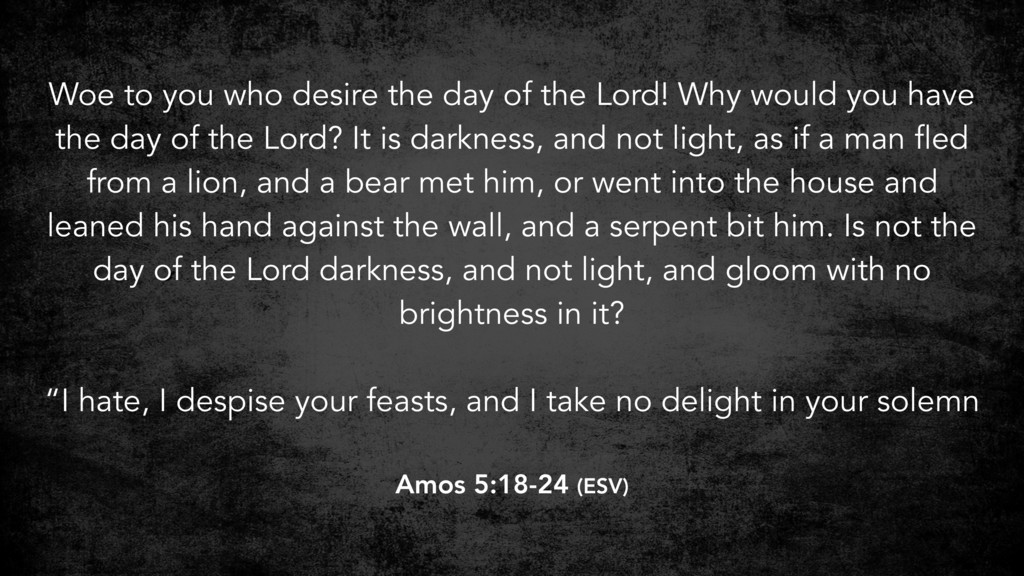 Why would you have the day of the Lord? It is darkness, and not light, as if a man fled from a lion, and a bear met him, or went into the house and leaned his hand against the wall, and a serpent bit him. Is not the day of the Lord darkness, and not light, and gloom with no brightness in it? “I hate, I despise your feasts, and I take no delight in your solemn Amos 5:18-24 (ESV)