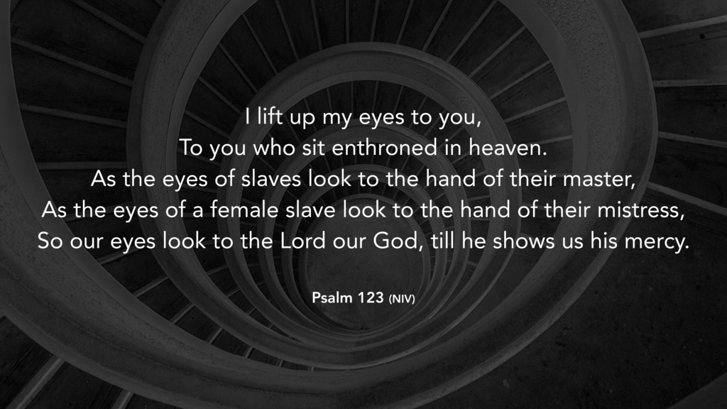 sit enthroned in heaven. As the eyes of slaves look to the hand of their master, As the eyes of a female slave look to the hand of their mistress, So our eyes look to the Lord our God, till he shows us his mercy. Psalm 123 (NIV)