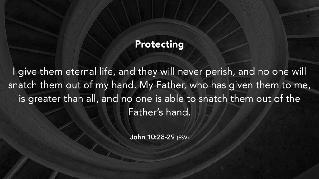 perish, and no one will snatch them out of my hand. My Father, who has given them to me, is greater than all, and no one is able to snatch them out of the Father’s hand. John 10:28-29 (ESV)
