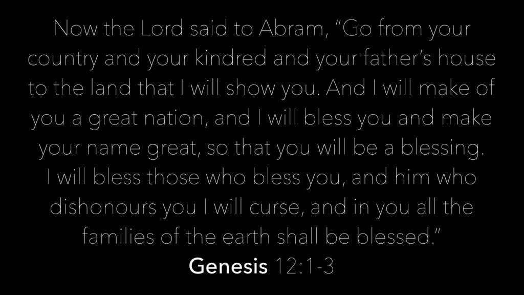 and your kindred and your father’s house to the land that I will show you. And I will make of you a great nation, and I will bless you and make your name great, so that you will be a blessing. I will bless those who bless you, and him who dishonours you I will curse, and in you all the families of the earth shall be blessed.” Genesis 12:1-3