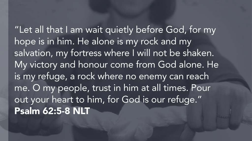 my hope is in him. He alone is my rock and my salvation, my fortress where I will not be shaken. My victory and honour come from God alone. He is my refuge, a rock where no enemy can reach me. O my people, trust in him at all times. Pour out your heart to him, for God is our refuge.” Psalm 62:5-8 NLT