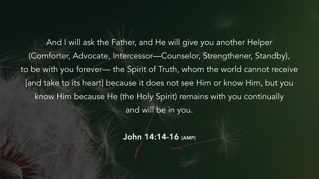 you another Helper (Comforter, Advocate, Intercessor—Counselor, Strengthener, Standby), to be with you forever— the Spirit of Truth, whom the world cannot receive [and take to its heart] because it does not see Him or know Him, but you know Him because He (the Holy Spirit) remains with you continually and will be in you. John 14:14-16 (AMP)
