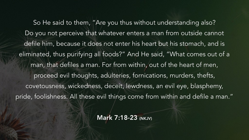 also? Do you not perceive that whatever enters a man from outside cannot defile him, because it does not enter his heart but his stomach, and is eliminated, thus purifying all foods?” And He said, “What comes out of a man, that defiles a man. For from within, out of the heart of men, proceed evil thoughts, adulteries, fornications, murders, thefts, covetousness, wickedness, deceit, lewdness, an evil eye, blasphemy, pride, foolishness. All these evil things come from within and defile a man.” Mark 7:18-23 (NKJV)
