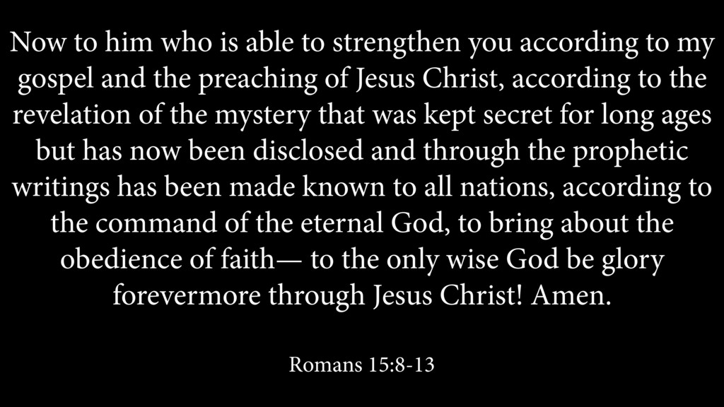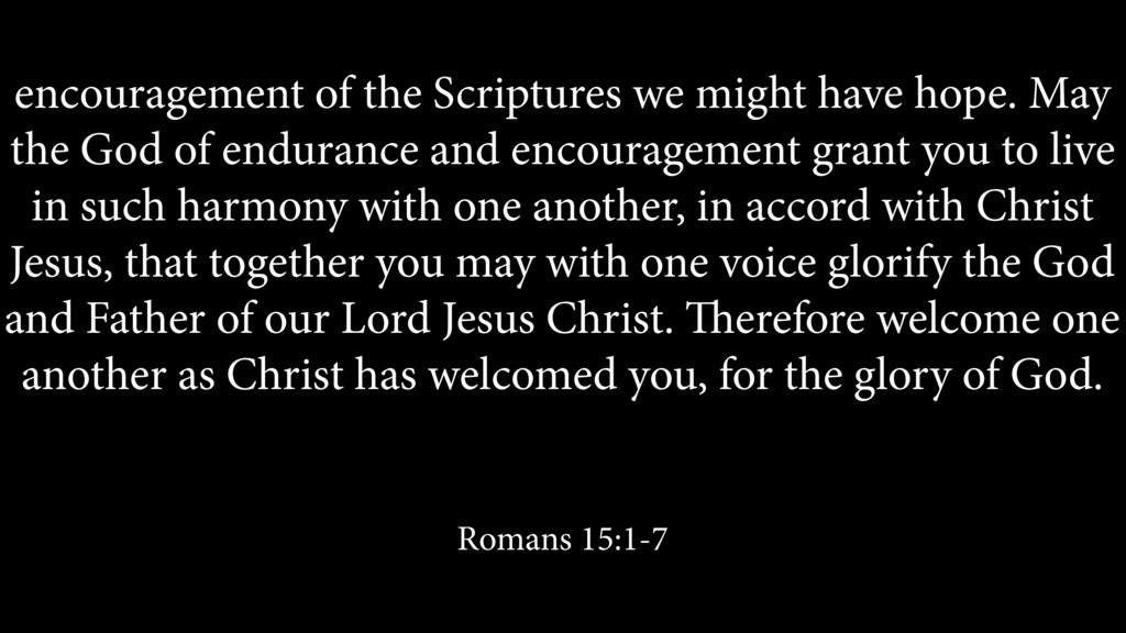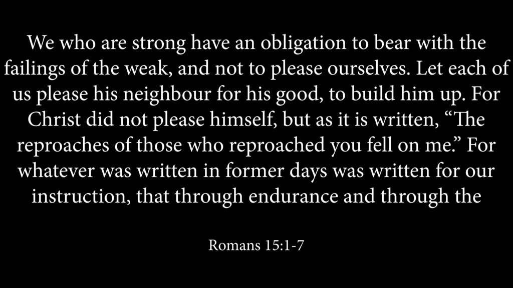 the failings of the weak, and not to please ourselves. Let each of us please his neighbour for his good, to build him up. For Christ did not please himself, but as it is written, “The reproaches of those who reproached you fell on me.” For whatever was written in former days was written for our instruction, that through endurance and through the Romans 15:1-7