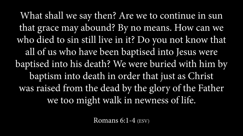 sun that grace may abound? By no means. How can we who died to sin still live in it? Do you not know that all of us who have been baptised into Jesus were baptised into his death? We were buried with him by baptism into death in order that just as Christ was raised from the dead by the glory of the Father we too might walk in newness of life. Romans 6:1-4 (ESV)