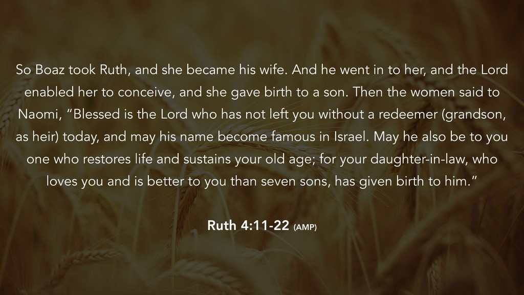 father of Hezron, Hezron was the father of Ram, Ram the father of Amminadab, Amminadab the father of Nahshon, Nahshon the father of Salmon, Salmon the father of Boaz, Boaz the father of Obed, Obed the father of Jesse, and Jesse the father of David [the king of Israel and the ancestor of Jesus Christ]. Ruth 4:11-22 (AMP)